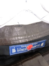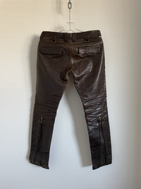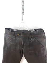Blackmeans leather pants in brown, never seen this colour for sale before. Fantastic quality as always from Blackmeans. Pictures make it look grey-brownish but that's just the lighting, true colour is brown so I've added the 2nd and 3rd photos to best reflect this. Leg opening is adjustable, measurement taken with it fully unzipped. Condition: Worn with no flaws Based out of Toronto, Canada. Check out our other listings for more great pieces and follow our seller page to get updated whenever we post a new item