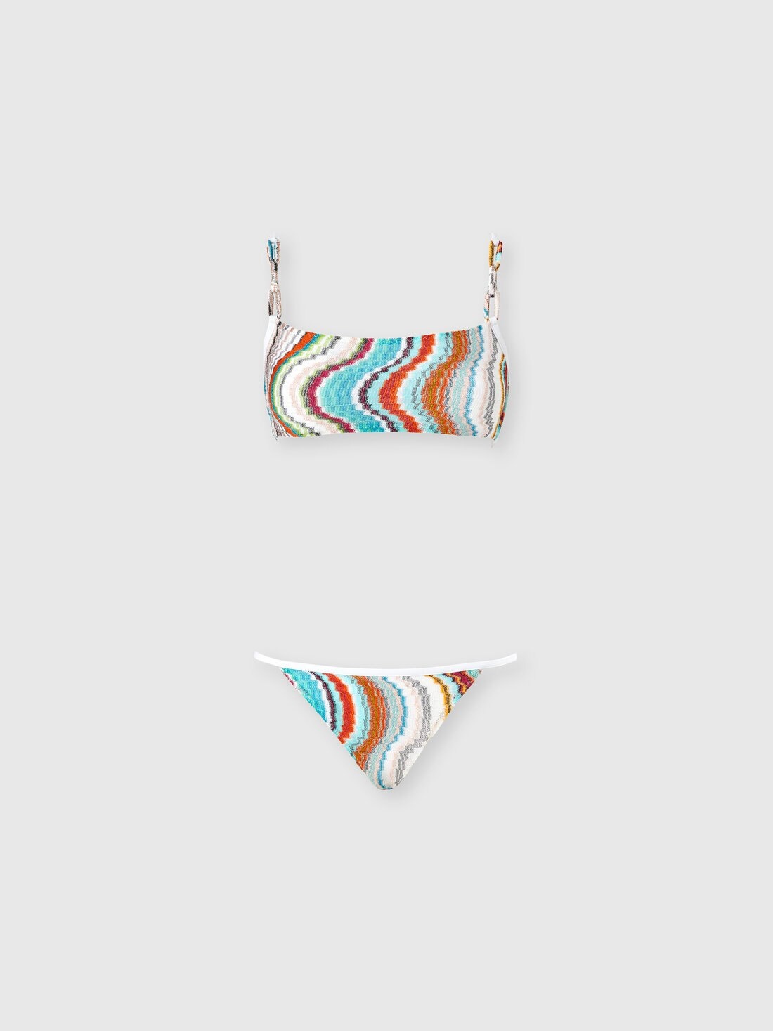 Recalling the natural flow of the sea, the bandeau bikini from the Missoni fashion house is crossed by a wave motif in raschel and lame knit, which gives the fabric a vibrant and iridescent texture. The double strap closure at the back finishes the design with a contemporary and refined touch. MORE DETAILS - Bandeau bikini - Wave pattern - Raschel and lame processing - Double back strap Composition: EXTERNAL:95%Rayon, 5%Metal Fiber; LINING : 80%Polyamide, 20%Elastane Care instructions: Hand wash ; Do not tumble dry ; Do not dry clean ; Do not iron ; Do not bleach Made in: Italy Product ID MS25SP0ABR0100SM9L0