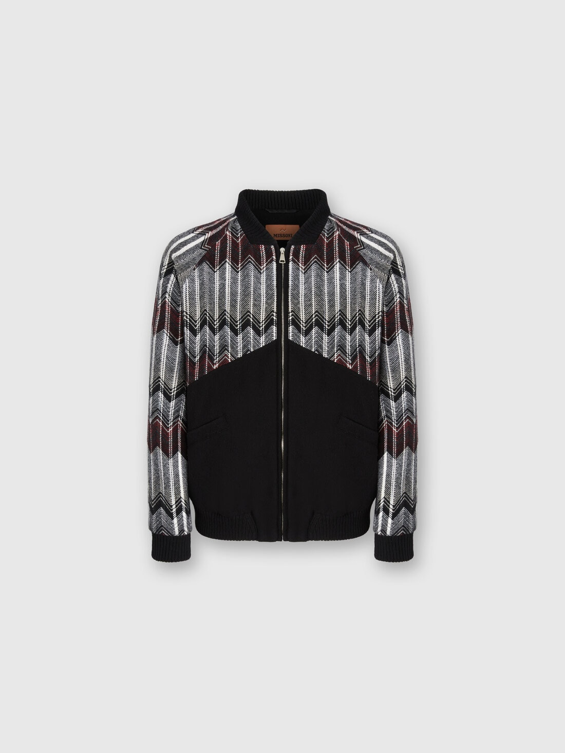 This men's bomber jacket combines Missoni's artisanal tradition with a modern aesthetic, thanks to the knitted fabric made on a loom from a wool and cotton blend. The woven zigzag motif at the top creates dynamic geometric lines that contrast with the solid color of the lower part. Finished with a zip and pockets, it’s a garment that blends graphic style and functionality with the unmistakable touch of the maison. MORE DETAILS - Bomber jacket - Woven zigzag insert and solid color - Zip and pockets - Wool and cotton blend Composition: EXTERNAL:72%Wool, 22%Cotton, 6%Polyamide; INSERTS:38%Cotton, 27%Polyester, 19%Acrylic, 12%Wool, 4%Other fibres; INTERNAL:100%Polyester Care instructions: Ironing maximum temperature 110°C - without steam ; Dry cleaning in tetrachloroethene - mild process ; COOL HAND WASH ; Do not tumble dry ; Do not wash ; Do not bleach Made in: Italy Product ID US25WC0CBC0059S4171