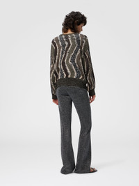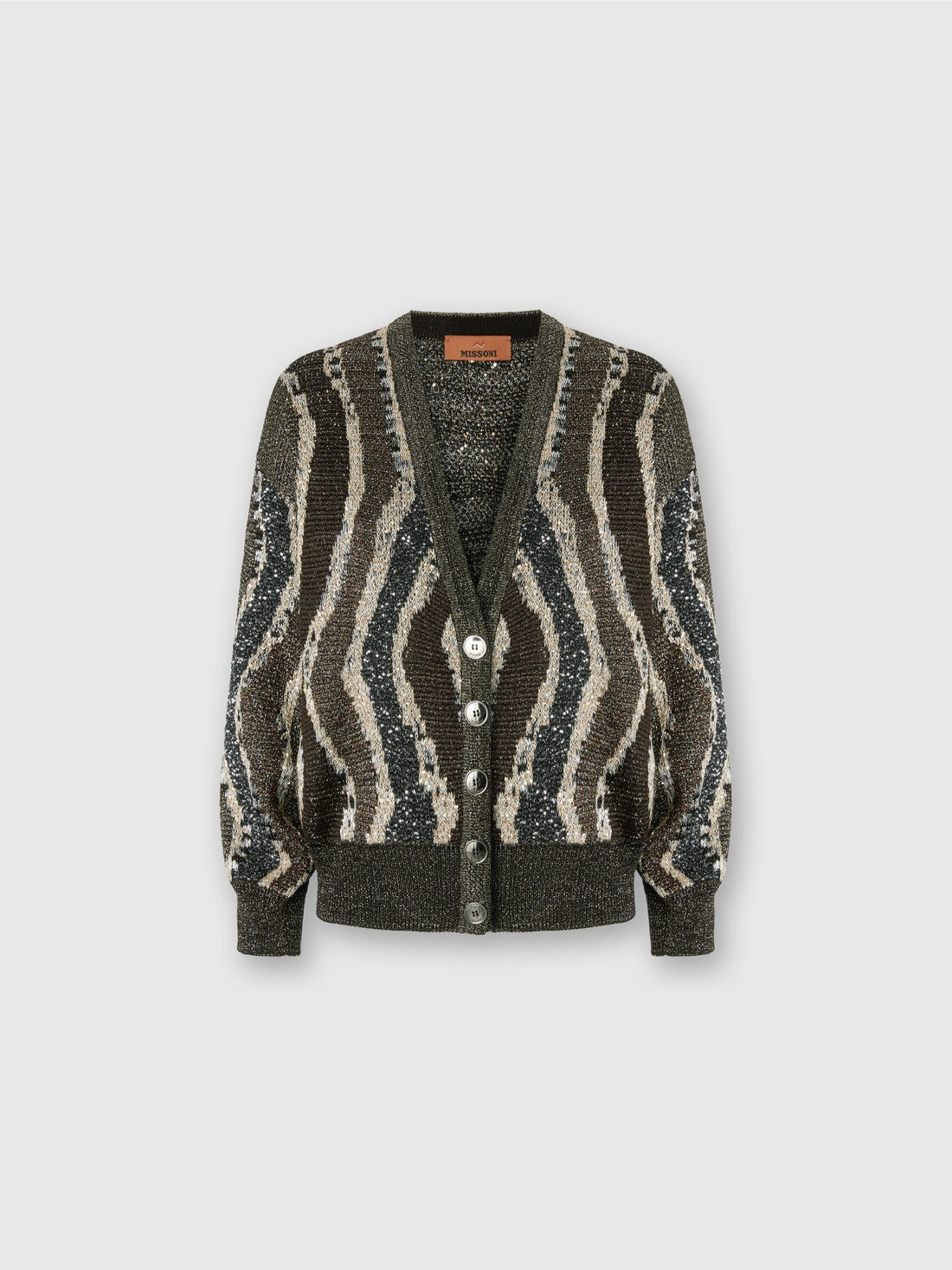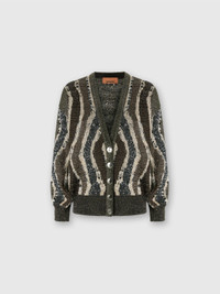 Boxy women’s cardigan with a modern character, featuring buttons and made of jacquard with a distinctive wave motif. The applied sequins give the garment a touch of brightness, making it perfect for adding an elegant and dynamic detail to any outfit. MORE DETAILS - Boxy buttoned cardigan - Jacquard knit - Wave pattern - Viscose blend with sequins and lame threads Composition: EXTERNAL:49%Rayon, 44%Polyamide, 7%Metal Fiber Care instructions: Ironing maximum temperature 110°C - without steam ; Dry cleaning in tetrachloroethene - mild process ; Wash in net bag ; Dry flat ; Dry inside out ; Do not tumble dry ; Iron inside out ; Do not wash ; Do not bleach Made in: Italy Product ID DS25WM0CBK01C8S80E2
