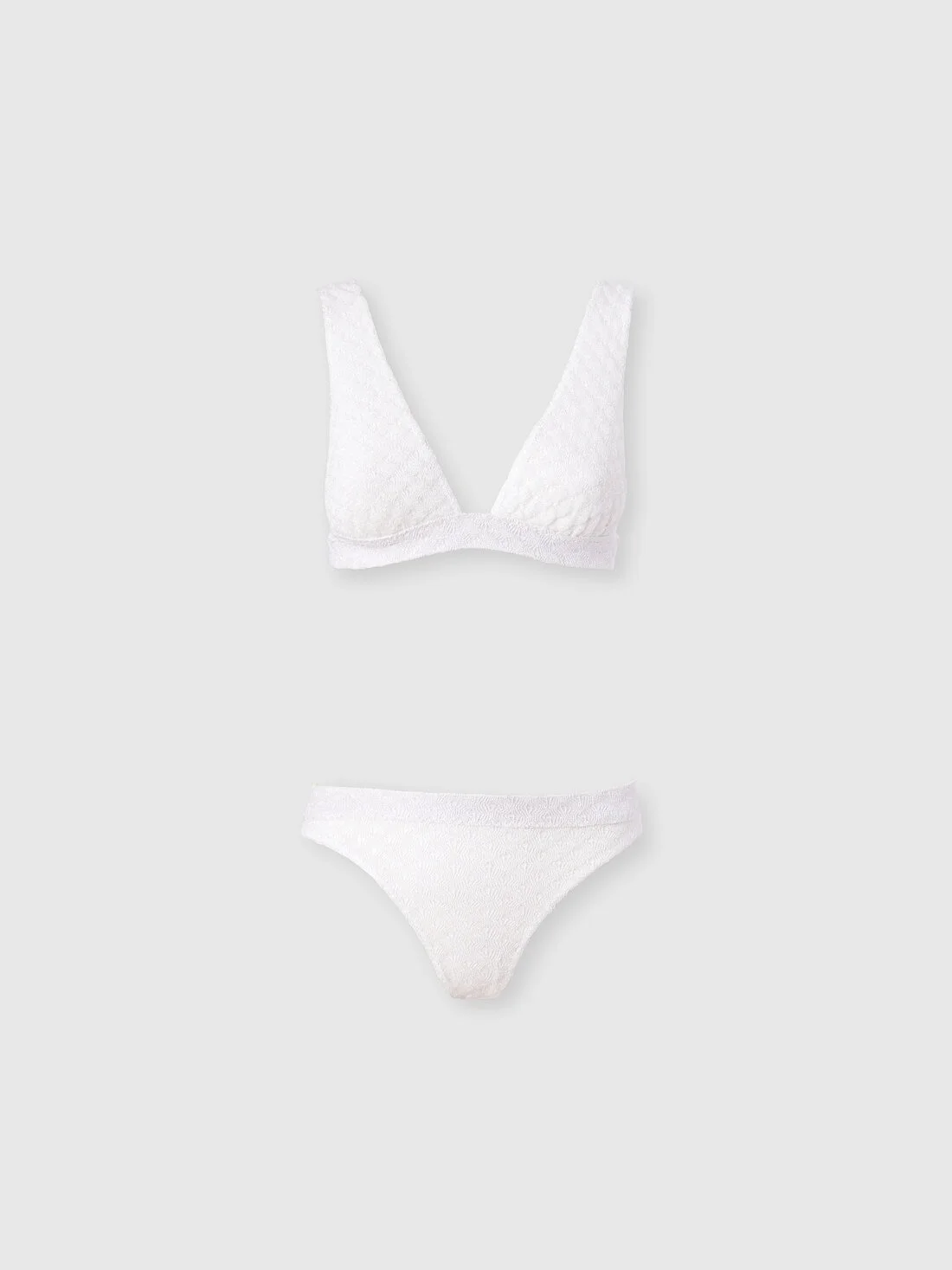 MORE DETAILS - Women's bralette bikini - Raschel knit - Spiderweb lace pattern - Viscose lame blend Composition: EXTERNAL:83%Rayon, 17%Metal Fiber; LINING : 90%Polyamide, 10%Elastane Care instructions: Hand wash ; Do not tumble dry ; Do not dry clean ; Do not iron ; Cool Hand Wash ; Do not bleach Made in: Italy Product ID MC22SP02BR014RS01JW