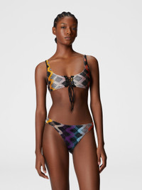 The brasserie bikini combines comfort and sophistication with front ties on the top, mesh details, and Raschel craftsmanship enriched by the sparkle of lame. A piece that demands attention. MORE DETAILS - Women's brasserie bikini - Front tie decoration - Mesh and raschel workmanship - Sparkling lame details Composition: EXTERNAL:73%Rayon, 14%Metal Fiber, 13%Polyamide; LINING : 80%Polyamide, 20%Elastane Care instructions: Hand wash ; Do not tumble dry ; Do not dry clean ; Do not iron ; Do not bleach Made in: Italy Product ID MS25SP0LBR012SSM9QM