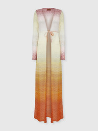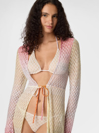 To complete summer outfits with style, this long lame viscose cover-up cardigan for women features a degrade spiderweb motif that plays with reflections and transparencies. The long sleeves and luminous shades enhance its fluidity, expressing the unmistakable elegance of the maison. MORE DETAILS - Women's long beach cover-up cardigan with long sleeves - Raschel knit - Degrade spiderweb lace pattern - Viscose lame blend Composition: EXTERNAL:85%Rayon, 15%Metal Fiber Care instructions: Ironing maximum temperature 110°C - without steam ; Dry cleaning in tetrachloroethene ; Do not tumble dry ; Do not wash ; Do not bleach Made in: Italy Product ID MS26SQ0SBR014ES4183