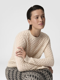 Elegant and refined, this women’s crew-neck pullover in 100% cashmere highlights the softness and lightness of the yarns—an expression of Missoni’s ongoing pursuit of quality and refinement in materials. The delicate lace-inspired knit adds depth and movement to the fabric, giving the garment a discreet and sophisticated elegance. MORE DETAILS - Women's crewneck pullover - Long sleeves - Raschel knit - Lace pattern - 100% cashmere Composition: EXTERNAL:100%Cashmere goat Care instructions: Dry cleaning in tetrachloroethene - mild process ; Ironing maximum temperature 110°C - without steam ; Dry flat ; Do not tumble dry ; Do not wash ; Do not bleach Made in: Italy Product ID DC26SN05BR0151S01KD