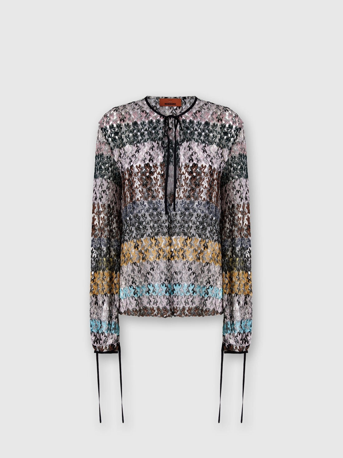 A bold and sophisticated design characterizes this women’s blouse with crew neck and teardrop opening, made with refined raschel lace in striped pattern. The lame threads in viscose blend provide delicate light, creating a refined and impactful look. MORE DETAILS - Crew neck blouse - Keyhole neckline with ties - Raschel knit - Sheer-effect lace pattern - Wide sleeves with ties Composition: EXTERNAL:92%Rayon, 8%Metal Fiber Care instructions: Dry cleaning in tetrachloroethene - mild process ; Ironing maximum temperature 110°C - without steam ; Dry flat ; Do not tumble dry ; Do not wash ; Do not bleach Made in: Italy Product ID DS25WJ0KBR012ISM9QX
