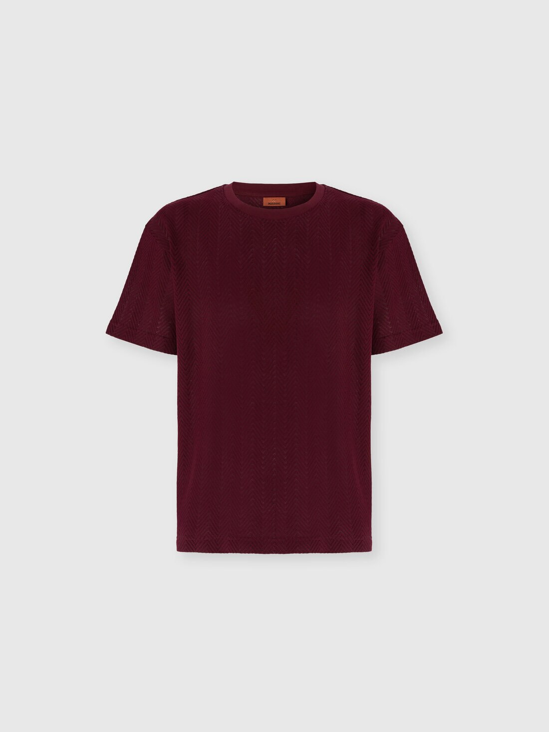 A refined cotton and viscose knit for this men's short-sleeve crew-neck T-shirt. The raschel workmanship with tone-on-tone zigzag defines the relaxed-fit model. MORE DETAILS - Crew-neck T-shirt short sleeve - Cotton and viscose knit - Tone-on-tone raschel pattern Composition: EXTERNAL:74%Cotton, 26%Rayon; INSERTS:100%Cotton Care instructions: Ironing maximum temperature 110°C - without steam ; Hand wash ; Dry cleaning in tetrachloroethene - mild process ; Do not tumble dry ; Dry flat ; COOL HAND WASH ; Do not bleach Made in: Italy Product ID US25WL02BR0122S417O