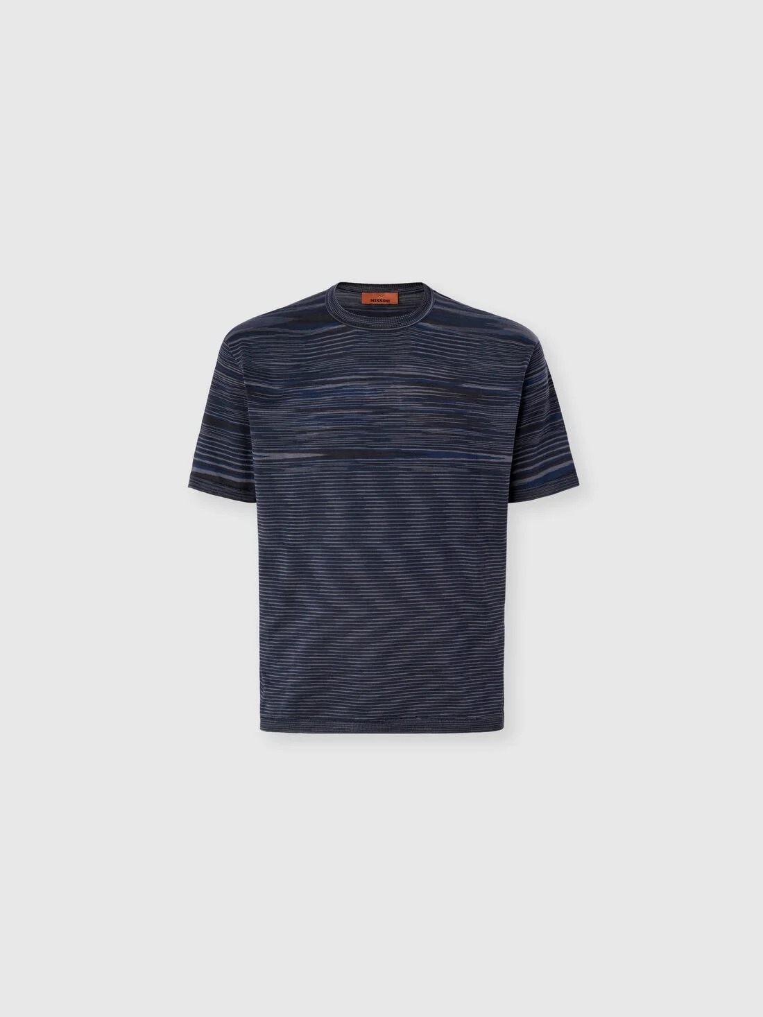 Crafted from slub mercerized cotton, this men’s crew-neck short-sleeved T-shirt stands out for its smooth feel and the sheen of the fabric, the result of a process that enhances the quality and brilliance of the fibers. An essential piece defined by understated, contemporary elegance in true Missoni style. MORE DETAILS - Men’s crew-neck T-shirt - Short sleeves - Mercerized flamed knit - 100% cotton Composition: EXTERNAL:97%Cotton, 2%Polyamide, 1%Elastane Care instructions: Hand wash ; Ironing maximum temperature 110°C - without steam ; Dry cleaning in tetrachloroethene ; Do not tumble dry ; Dry flat ; Iron with a cloth between ; Do not bleach Made in: Italy Product ID US26SL0KBK01HUF700V