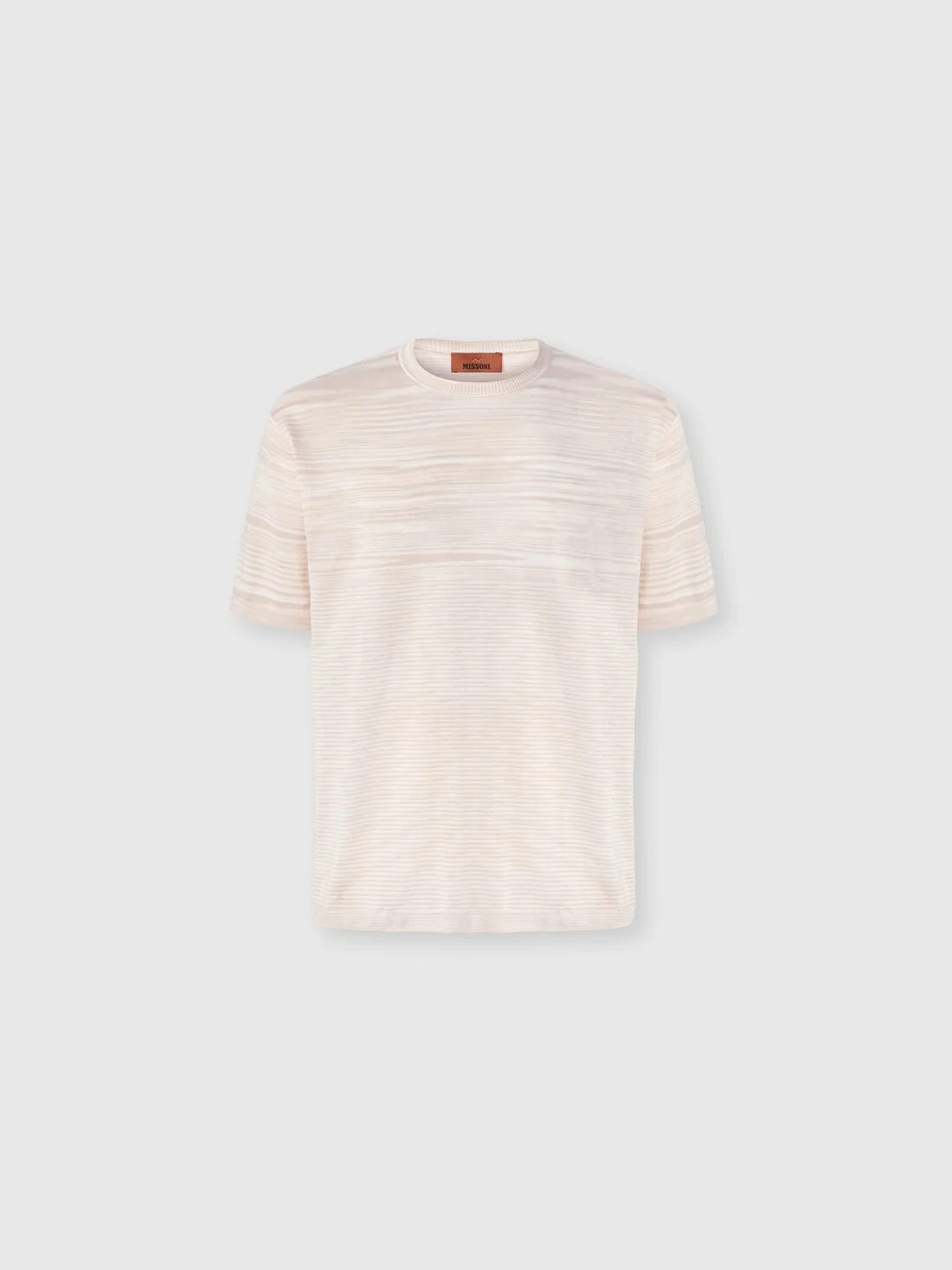 Crafted from slub mercerized cotton, this men’s crew-neck short-sleeved T-shirt stands out for its smooth feel and the sheen of the fabric, the result of a process that enhances the quality and brilliance of the fibers. An essential piece defined by understated, contemporary elegance in true Missoni style. MORE DETAILS - Men’s crew-neck T-shirt - Short sleeves - Mercerized flamed knit - 100% cotton Composition: EXTERNAL:97%Cotton, 2%Polyamide, 1%Elastane Care instructions: Hand wash ; Ironing maximum temperature 110°C - without steam ; Dry cleaning in tetrachloroethene ; Do not tumble dry ; Dry flat ; Iron with a cloth between ; Do not bleach Made in: Italy Product ID US26SL0KBK01HUF000C