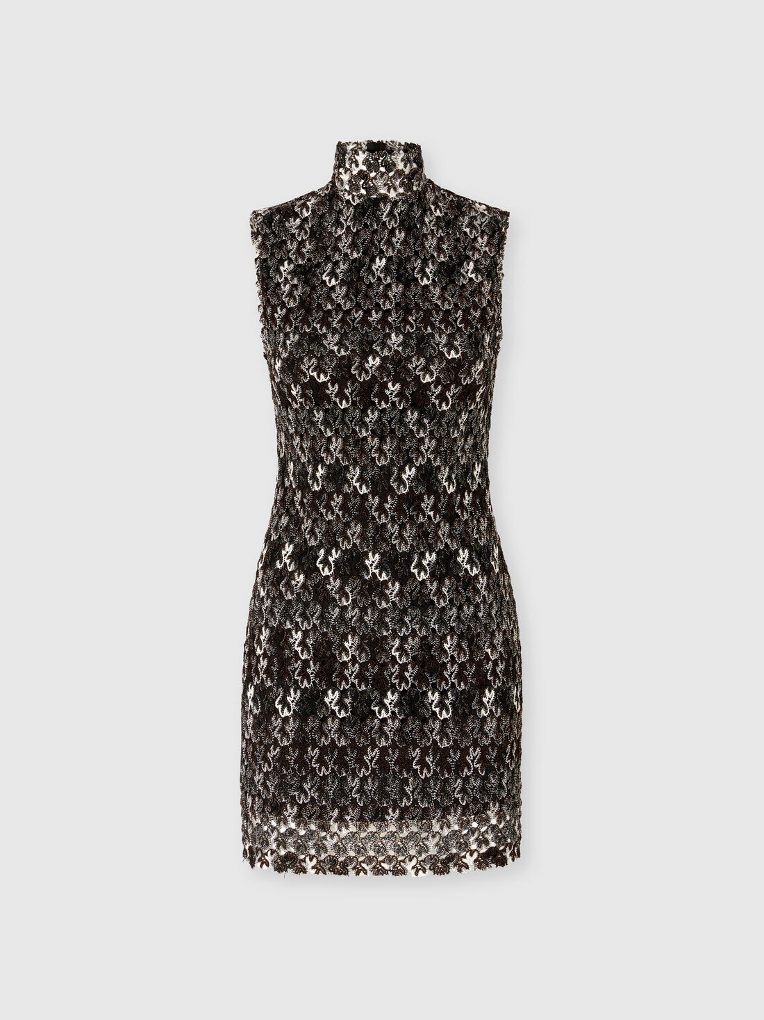 Bold yet refined, this women’s sleeveless mini dress with high neck is crafted from lace raschel knit—a hallmark of Missoni’s artisanal excellence. Lame threads woven into the fabric give it a vibrant glow, highlighting its rich texture and minimalist design. MORE DETAILS - Sleeveless mini dress - High neck - Raschel knit with lace-effect - Lurex threads - Viscose blend Composition: EXTERNAL:91%Rayon, 9%Metal Fiber; LINING : 82%Polyester, 18%Elastane Care instructions: Dry cleaning in tetrachloroethene - mild process ; Ironing maximum temperature 110°C - without steam ; Do not tumble dry ; Dry flat ; Do not wash ; Do not bleach Made in: Italy Product ID DS25WG22BR012HS80DP