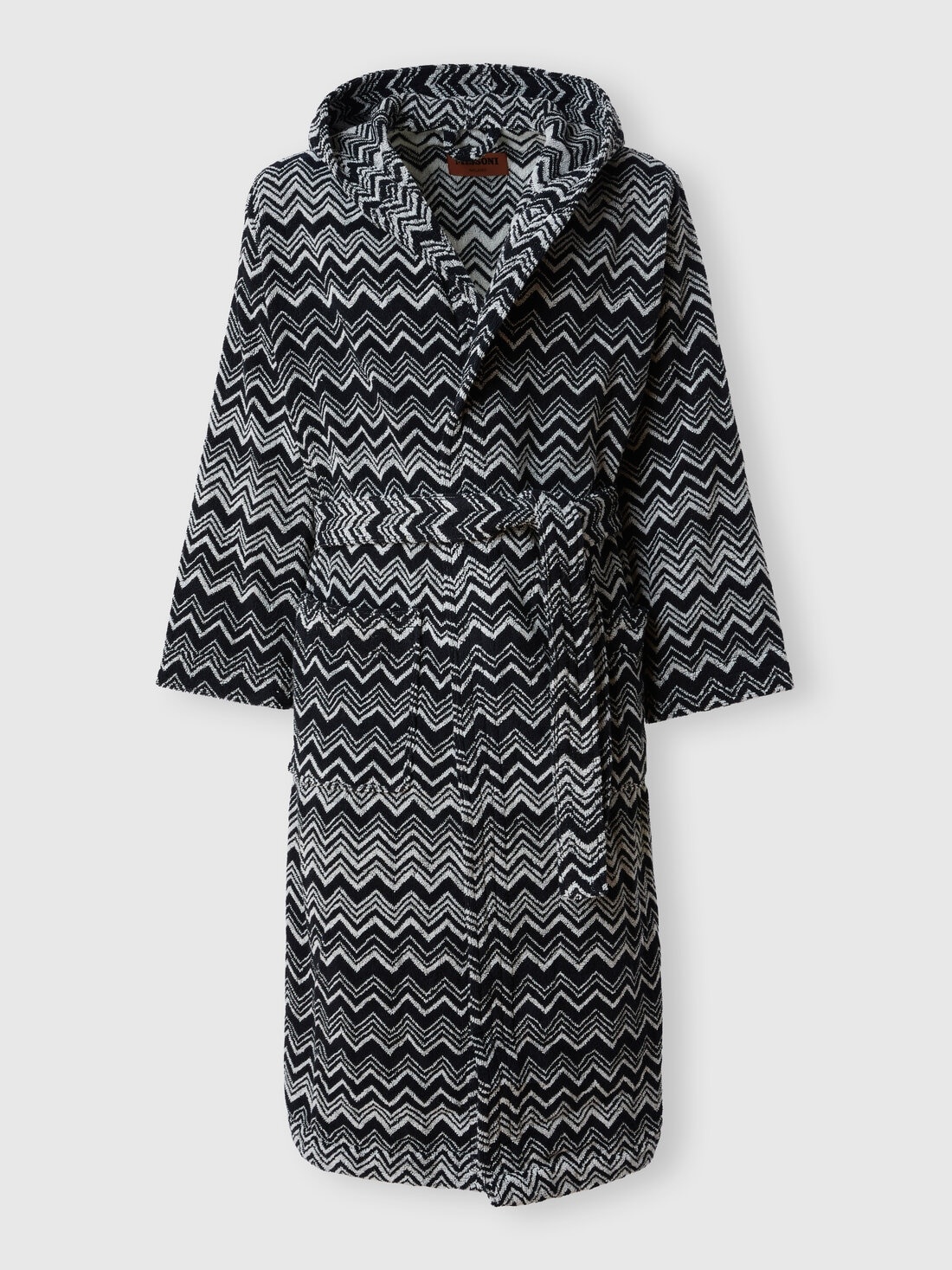 Even in the bathroom, MissoniHome never misses a touch of original luxury. Proof of this is in the Keith cotton terry hooded bathrobe, with waist belt and patch pockets, to which the chevron pattern gives a precious twist. MORE DETAILS - Cotton terry bathrobe - Chevron pattern - Waist belt - Hood - Patch pockets Composition: EXTERNAL:100%Cotton Care instructions: Ironing maximum temperature 150°C ; Do not dry clean ; Tumble drying at lower temperature ; Wash max 40°C ; Do not bleach Made in: Portugal Product ID 1K3AC99730601