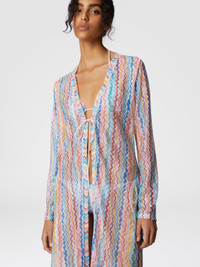 A piece with classic charm, the long cover-up with V-neck combines the practicality of a cardigan design with the refinement of the iconic zigzag pattern. The printed Raschel craftsmanship and fluid silhouette make it perfect for an elegant and relaxed summer look. MORE DETAILS - Women's long cover-up - V-neck - Ruffled skirt - Raschel printed workmanship - Iconic zig zag pattern Composition: EXTERNAL:100%Polyester Care instructions: Ironing maximum temperature 110°C - without steam ; Dry cleaning in tetrachloroethene ; Do not tumble dry ; Do not wash ; Do not bleach Made in: Italy Product ID MC25SQ05BR0130SM9QJ