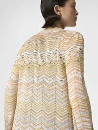 A model that reflects Missoni’s unmistakable craftsmanship, this long women’s cardigan in viscose chevron lame with sequins adds a touch of light and refinement, perfect for completing any outfit with style. MORE DETAILS - Women's long cardigan - Chevron knit - Viscose lame - Applied sequins Composition: EXTERNAL:77%Rayon, 12%Polyamide, 11%Metal Fiber Care instructions: Ironing maximum temperature 110°C - without steam ; Hand wash ; Dry cleaning in tetrachloroethene ; Do not tumble dry ; Dry flat ; Do not bleach Made in: Italy Product ID DS26SM0HBK01H9SM9ZU