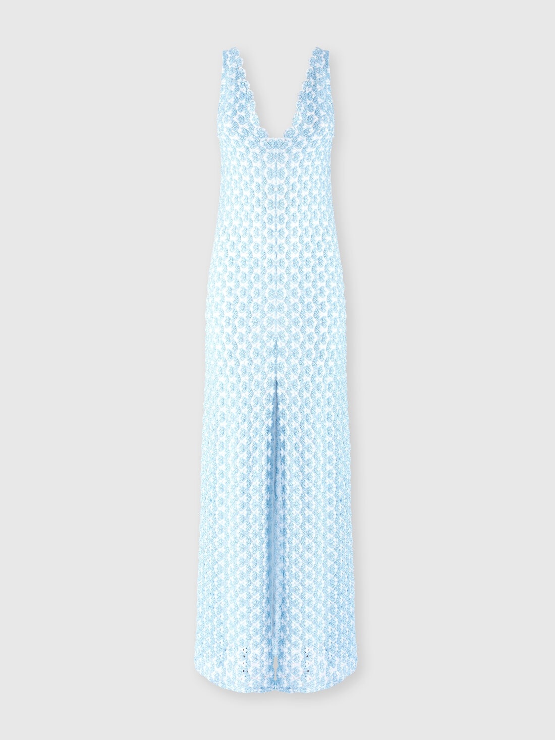 Sensual and elegant, the long cover-up features a V-neckline and an open back, crafted in Raschel lacework. The sheer effect and the front slit of the skirt create movement and lightness, adding an irresistible allure. MORE DETAILS - Women's long cover-up - Open back design - Raschel workmanship with lame details - Sensual sheer effect Composition: EXTERNAL:90%Rayon, 10%Metal Fiber Care instructions: Ironing maximum temperature 110°C - without steam ; Dry cleaning in tetrachloroethene ; Do not tumble dry ; Do not wash ; Do not bleach Made in: Italy Product ID MS25SQ1NBR012TS72L5