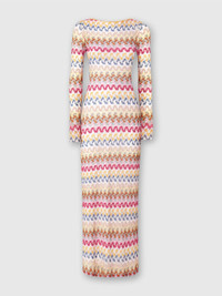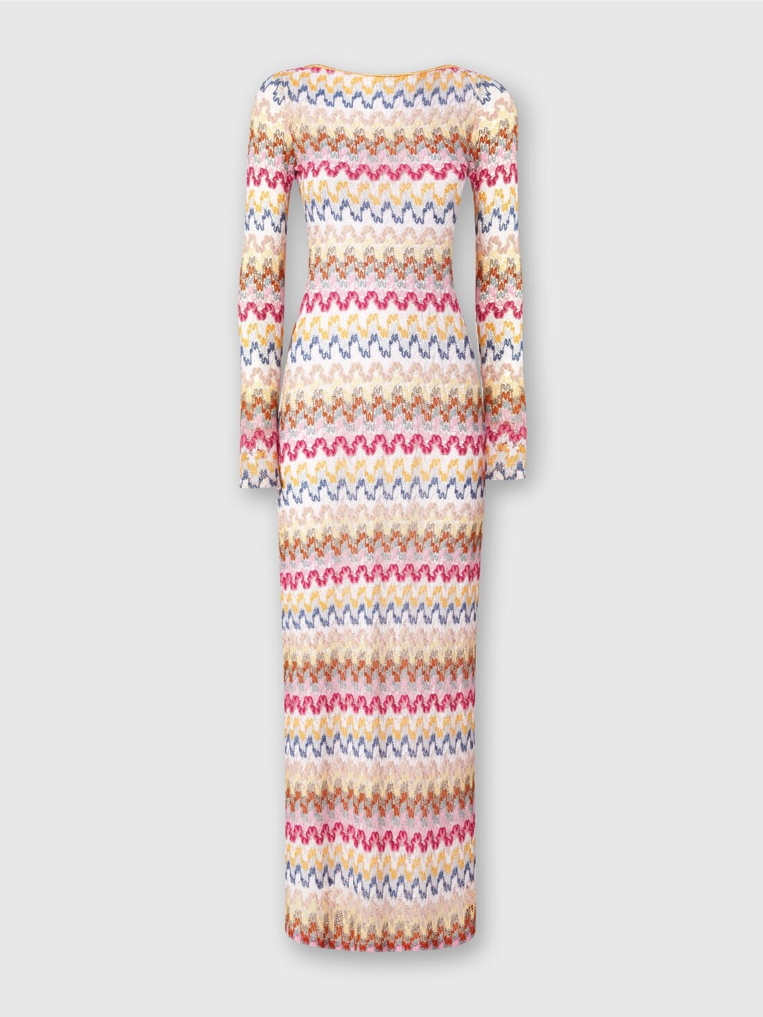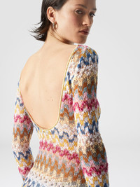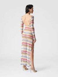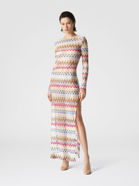 The long dress in lame viscose lace by Missoni stands out for its sophisticated elegance and craftsmanship. The zigzag pattern, illuminated by lame, gives the garment a luminous and dynamic effect, while the fluid and light silhouette envelops the figure with grace. The most seductive detail is the open back, which adds a sensual and refined touch. MORE DETAILS - Long dress - Lame viscose lace - Backless - Zigzag pattern Composition: EXTERNAL:95%Rayon, 5%Metal Fiber Care instructions: Ironing maximum temperature 110°C - without steam ; Dry cleaning in tetrachloroethene ; Do not tumble dry ; Do not wash ; Do not bleach Made in: Italy Product ID MS25SQ14BR0000S01FQ