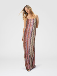 Feminine and refined, this sleeveless long Missoni dress expresses delicate sensuality. A deep round cut on the back adds a seductive touch, while the iconic zigzag raschel knit is enriched with lame threads that gracefully illuminate the silhouette—a celebration of the maison’s savoir-faire. MORE DETAILS - Long dress - Round back neckline - Raschel knit - Zig zag motif - Lurex threads - Viscose blend Composition: EXTERNAL:89%Rayon, 6%Metal Fiber, 5%Polyamide; LINING : 82%Polyester, 18%Elastane Care instructions: Wash max 30°C - Mild process ; Dry cleaning in tetrachloroethene - mild process ; Dry flat ; Steam iron only ; Do not tumble dry ; Do not iron ; Do not bleach Made in: Italy Product ID DS25WG0MBR012LSM9QY