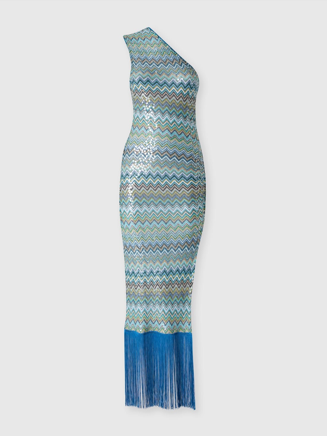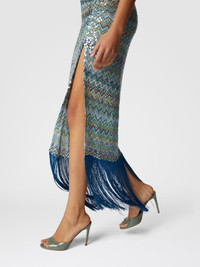Long one-shoulder cover-up dress in zig zag lamé viscose with sequins and fringes