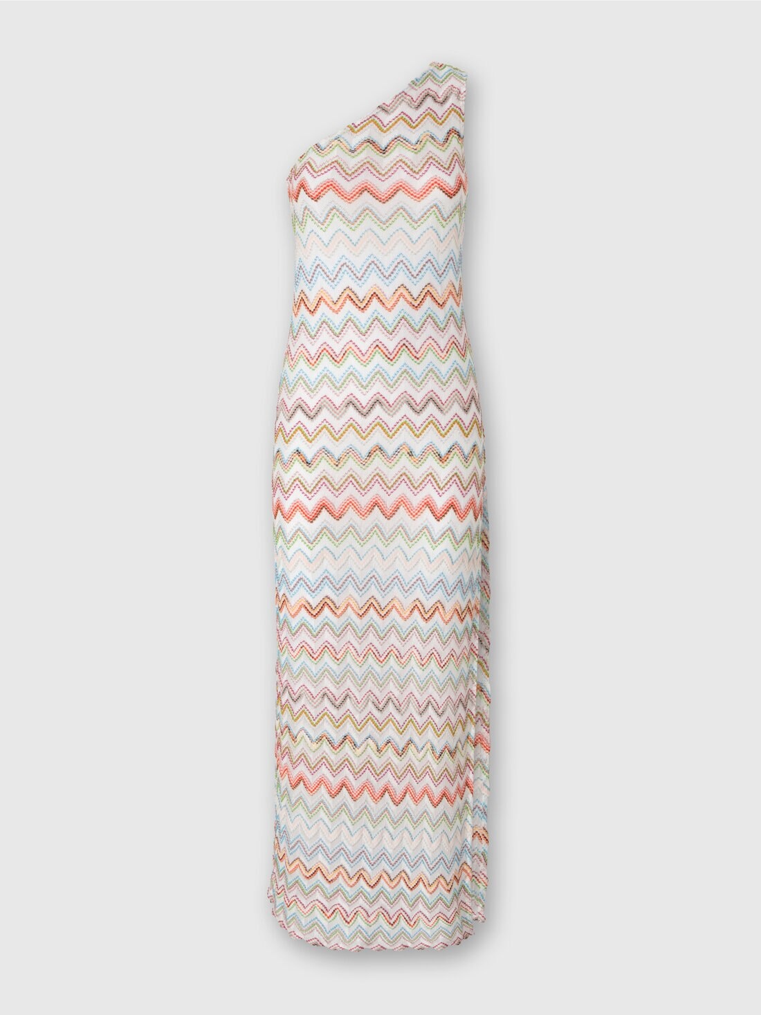 The long dress presented by the Missoni maison in a one-shoulder version with a 3D zigzag motif, is a synthesis of contemporary elegance. The lame illuminated fabric wraps the silhouette with sophisticated fluidity, while the asymmetrical off-the-shoulder design adds a touch of bold sophistication. MORE DETAILS - Long model dress - 3D zig zag pattern - One-shoulder - Viscose and lame blend Composition: EXTERNAL:61%Rayon, 30%Polyester, 9%Metal Fiber Care instructions: Ironing maximum temperature 110°C - without steam ; Dry cleaning in tetrachloroethene ; Do not tumble dry ; Do not wash ; Do not bleach Made in: Italy Product ID MS25SQ0PBR0101SM9KZ