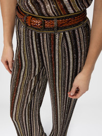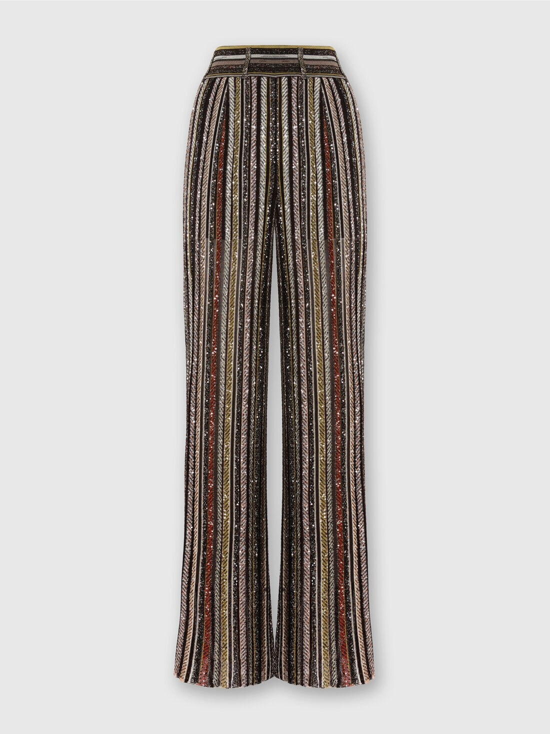 A long, straight-leg women’s trouser that plays with effects of light and transparency, made of herringbone striped knit in viscose blend with lame threads and sequins. A sophisticated and lightweight design, created to reflect every movement with elegance and personality. MORE DETAILS - Straight-leg long pants - Chevron stripe knit - Viscose blend with lame threads and sequins Composition: EXTERNAL:61%Rayon, 34%Polyamide, 4%Metal Fiber, 1%Elastane; LINING : 88%Polyester, 12%Elastane Care instructions: Ironing maximum temperature 110°C - without steam ; Dry cleaning in tetrachloroethene - mild process ; Wash in net bag ; Iron inside out ; Dry inside out ; Do not tumble dry ; Dry flat ; Do not wash ; Do not bleach Made in: Italy Product ID DS25WI09BK01C3SM9T5