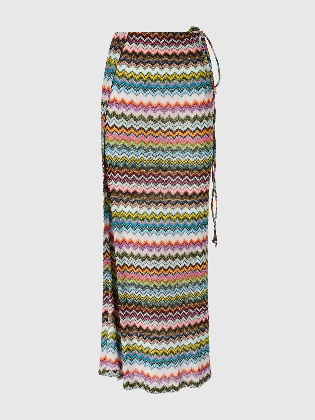 MORE DETAILS - Women's long wrap skirt with adjustable tie - Raschel knit - Micro zigzag pixel-effect pattern - Viscose lame Composition: EXTERNAL:83%Rayon, 17%Metal Fiber Care instructions: Ironing maximum temperature 110°C - without steam ; Dry cleaning in tetrachloroethene ; Do not tumble dry ; Do not wash ; Do not bleach Made in: Italy Product ID MC26SH02BR014FSM9YJ
