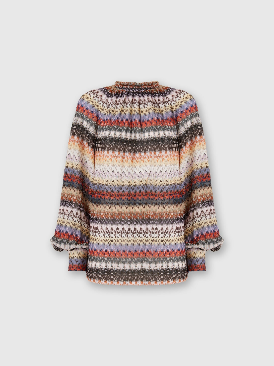Sophisticated lightness and luminous details define this relaxed-fit, crew-neck women’s blouse, characterized by wide sleeves and refined raschel lacework. Made from viscose blend with lame threads, it expresses modern elegance through refined textures and delicate reflections. MORE DETAILS - Relaxed-fit long-sleeve blouse - Wide sleeves - Raschel openwork lace knit - Viscose blend with lame threads Composition: EXTERNAL:91%Rayon, 9%Metal Fiber Care instructions: Dry cleaning in tetrachloroethene - mild process ; Wash max 30°C - Very mild process ; Steam iron only ; Do not tumble dry ; Dry flat ; Do not iron ; Do not bleach Made in: Italy Product ID DS25WJ0CBR012OSM9R4