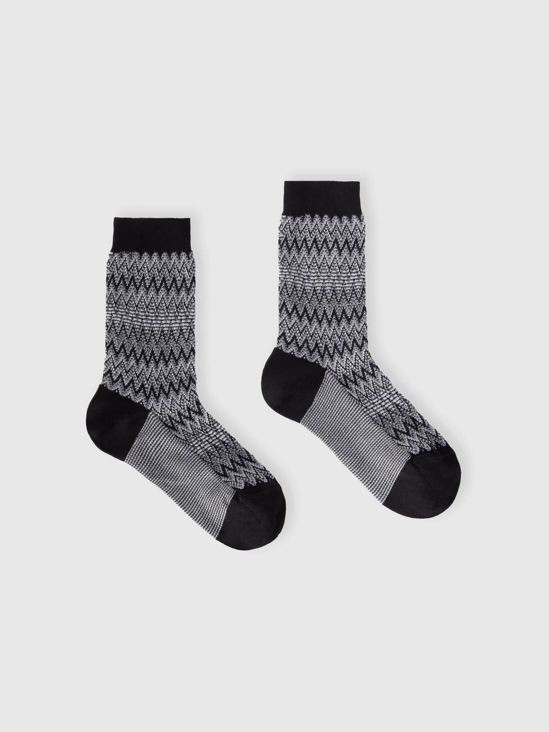 The iconic chevron and solid-color inserts define these mid-length cotton-blend women’s socks by Missoni, making them the perfect accessory for experimenting with everyday style. MORE DETAILS - Women’s mid-length socks - Cotton-blend zigzag - Solid-color details Composition: EXTERNAL:90%Cotton, 10%Polyamide Care instructions: Dry cleaning in tetrachloroethene ; Do not tumble dry ; Do not wash ; Do not iron ; Do not bleach Made in: Italy Product ID LS25WS0ABV00IHSM67T