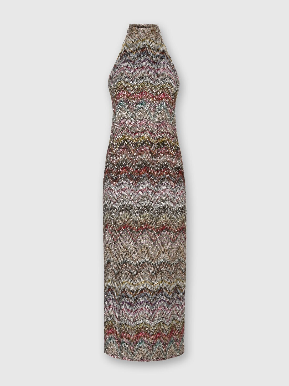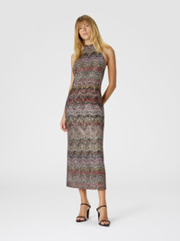 This sophisticated women’s midi dress features a halter neckline and high collar, designed to enhance the figure with elegance. Made using the exclusive Caperdoni loom, it’s enriched with a zigzag pattern woven with lame threads and sequins, creating an iridescent, refined fabric. Its clean lines and subtle brilliance make it ideal for evening events or special occasions. MORE DETAILS - Midi dress - Halter neckline - High neck - Caperdoni loom knit - Lurex threads and sequins - Viscose blend - Zig zag motif Composition: EXTERNAL:48%Rayon, 46%Polyamide, 6%Metal Fiber; LINING : 82%Polyester, 18%Elastane Care instructions: Dry cleaning in tetrachloroethene - mild process ; Dry flat ; Do not tumble dry ; Steam iron only ; Do not iron ; Do not wash ; Do not bleach Made in: Italy Product ID DS25WG1PBC005GS01HU