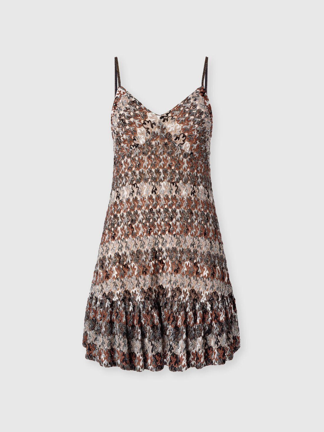 Sleeveless women’s mini dress with refined elegance, made with raschel lacework in viscose blend and lame threads that offer discreet brightness. The ruffles add dynamism and a feminine touch to the design, lightly enhancing the silhouette. MORE DETAILS - Mini dress with flounces - Raschel lace-effect knit - Viscose blend with lame threads Composition: EXTERNAL:91%Rayon, 9%Metal Fiber; LINING : 82%Polyester, 18%Elastane Care instructions: Dry cleaning in tetrachloroethene - mild process ; Ironing maximum temperature 110°C - without steam ; Dry flat ; Do not tumble dry ; Do not wash ; Do not bleach Made in: Italy Product ID DS25WG2FBR012HS80DQ