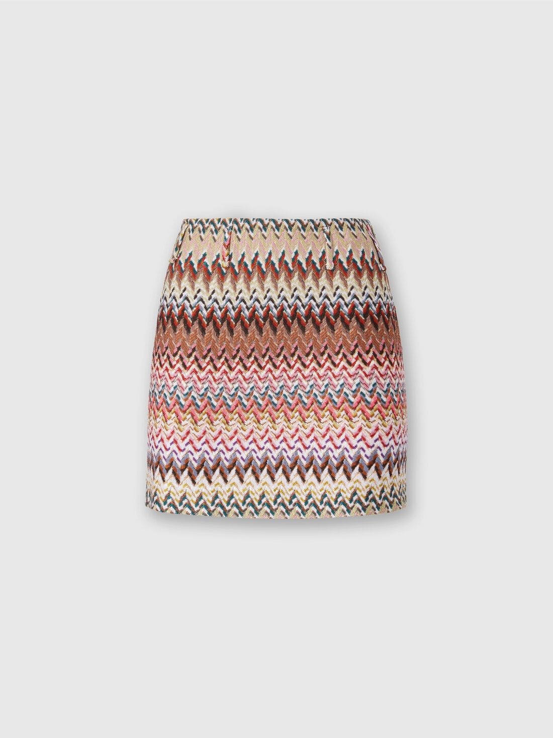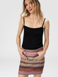 A women’s mini skirt that celebrates the iconic Missoni zigzag through refined raschel lace craftsmanship. Made from a viscose blend with lame threads, it combines brilliance and lightness in a lively, feminine design. MORE DETAILS - Mini skirt - Raschel knit with zig zag pattern - Viscose blend with lame threads Composition: EXTERNAL:89%Rayon, 6%Metal Fiber, 5%Polyamide; INTERNAL REINFORCEMENT:100%Polyester Care instructions: Wash max 30°C - Mild process ; Dry cleaning in tetrachloroethene - mild process ; Dry flat ; Steam iron only ; Do not tumble dry ; Do not iron ; Do not bleach Made in: Italy Product ID DS25WH0HBR012LSM9QY