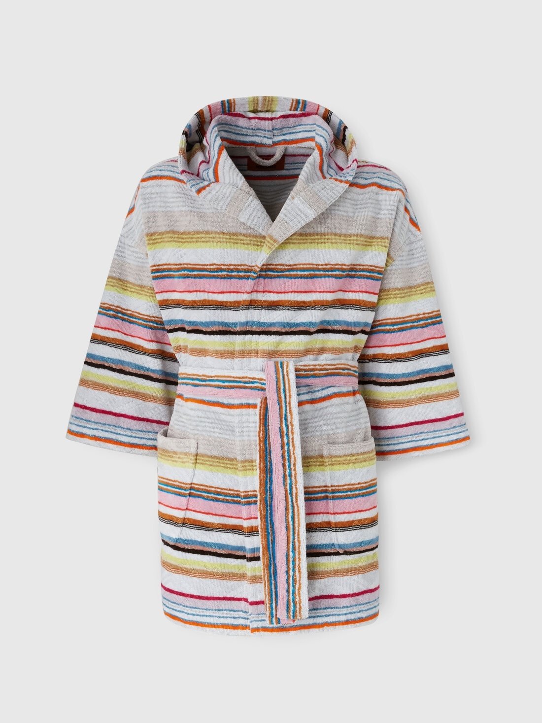 The Moonshadow cotton terry bathrobe, in its short version, features a refined vertical striped pattern, enriched with subtle lurex inserts that add a touch of shimmer. Coloured vertical stripes arranged in different densities create a dynamic visual effect on the soft chevron terry. Complete with waist belt, hood and patch pockets, the short model is the perfect accessory to add a touch of glamour to your daily routine. MORE DETAILS - Cotton terry bathrobe with lurex - Short model - Striped pattern - Waist belt - Hood - Patch pockets Composition: EXTERNAL:97%Cotton, 3%Metal Fiber Care instructions: Ironing maximum temperature 150°C ; Do not dry clean ; Tumble drying at lower temperature ; Wash max 40°C ; Do not bleach Made in: Portugal Product ID 1D3AC99711100