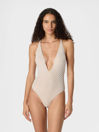 MORE DETAILS - Women's one-piece swimsuit - Deep V-neckline - Crossed straps at the back - Raschel knit - Spiderweb lace pattern - Viscose lame blend Composition: EXTERNAL:83%Rayon, 17%Metal Fiber; LINING : 90%Polyamide, 10%Elastane Care instructions: Hand wash ; Do not tumble dry ; Do not dry clean ; Do not iron ; Cool Hand Wash ; Do not bleach Made in: Italy Product ID MC22SP03BR014RS01JW