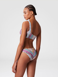 Crafted from a slub viscose blend with lurex reflections, the women's one-shoulder bikini expresses Missoni's eclectic DNA. The one-shoulder top design is animated by the striped motif that intertwines with the iridescent texture of the lame, creating a sophisticated play of light. The classic briefs complete the look, for a garment that perfectly blends elegance and dynamism. MORE DETAILS - One-shoulder bikini - Flamed viscose and lame - Striped pattern Composition: EXTERNAL:88%Rayon, 12%Metal Fiber; LINING : 80%Polyamide, 20%Elastane Care instructions: Hand wash ; Do not tumble dry ; Do not dry clean ; Do not iron ; Do not bleach Made in: Italy Product ID MC23SP02BR00ZZSM9L1