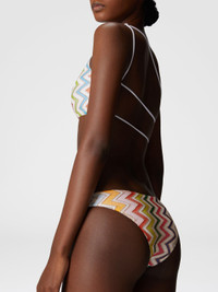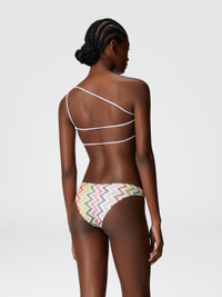With its one-shoulder silhouette and criss-cross ties at the back, the swimsuit in Raschel and lame highlights the iconic Missoni zigzag pattern. An ideal piece for refined, dynamic elegance. MORE DETAILS - Women's one-shoulder bikini - Double back ties - Iconic zig zag pattern Composition: EXTERNAL:60%Rayon, 25%Polyester, 15%Metal Fiber; LINING : 80%Polyamide, 20%Elastane Care instructions: Hand wash ; Do not tumble dry ; Do not dry clean ; Do not iron ; Do not bleach Made in: Italy Product ID MS25SP0YBR012RSM9QI
