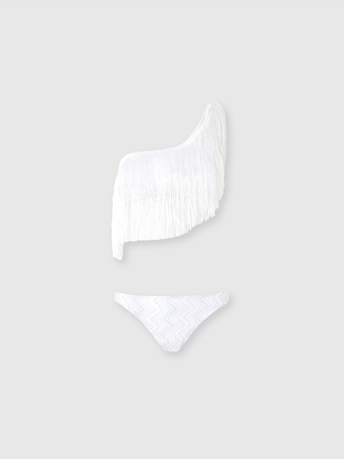 The one-shoulder lame viscose bikini by Missoni stands out for its asymmetrical design and the sheen of the fabric thanks to the lame. Fringes on the briefs add a touch of movement and sensuality, while the iconic chevron motif enhances the style with elegance and dynamism. MORE DETAILS - One-shoulder viscose bikini - Zigzag pattern - Decorative fringes Composition: EXTERNAL:91%Rayon, 9%Metal Fiber; LINING : 80%Polyamide, 20%Elastane Care instructions: Hand wash ; Do not tumble dry ; Do not dry clean ; Do not iron ; Do not bleach Made in: Italy Product ID MS25SP07BR00ZXS01FJ