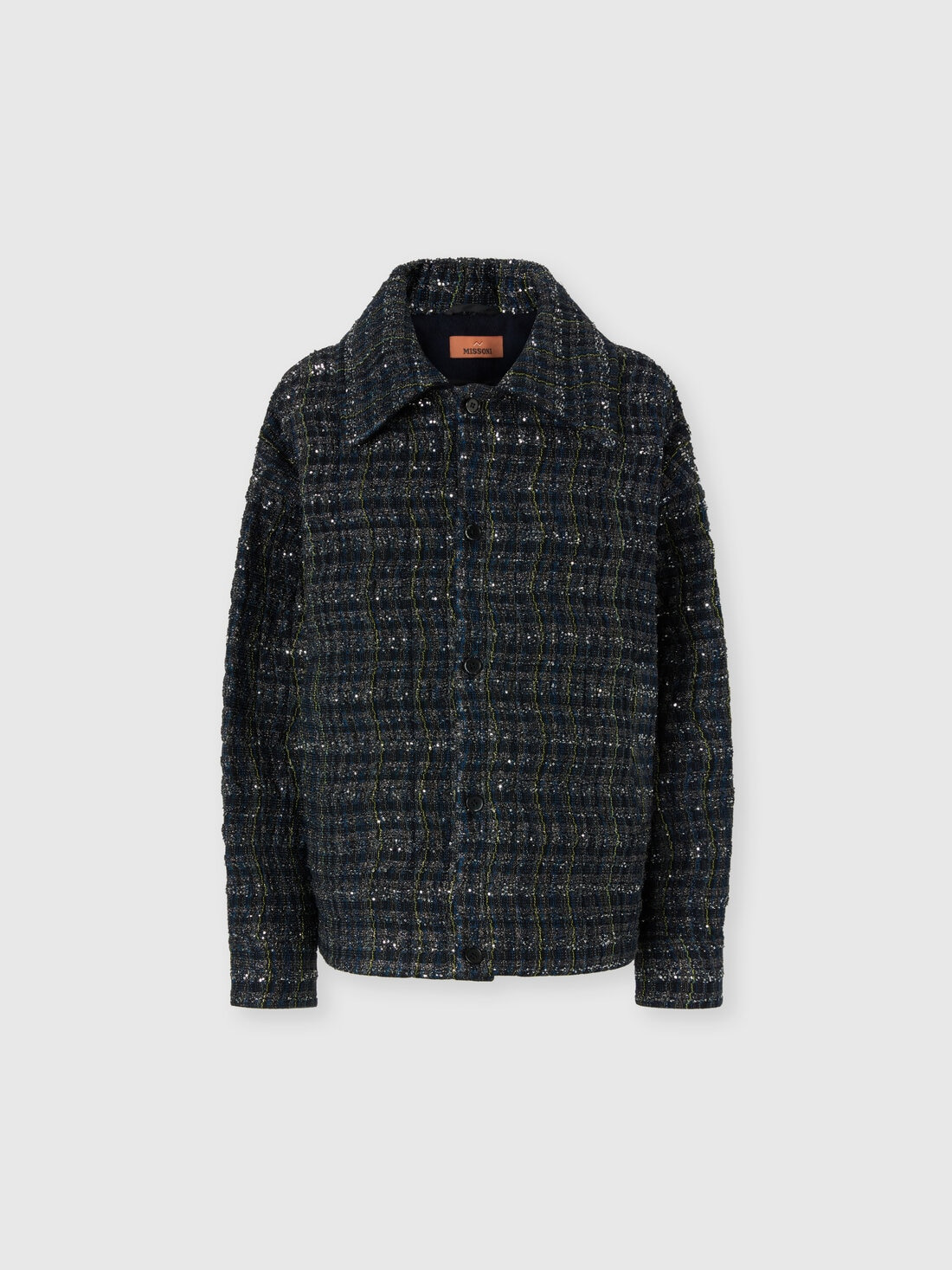 This women’s overshirt is crafted on a textured Caperdoni loom, featuring an exclusive check wave pattern that creates a dynamic and refined visual effect. The viscose-blend fabric is enriched with lame threads, adding luminous reflections and a touch of sophistication. A design that merges contemporary spirit with textile craftsmanship, perfect for those who want to stand out with elegance and personality. MORE DETAILS - Women's overshirt - Caperdoni framework weaving - Wave check pattern - Viscose and lame filament blend Composition: EXTERNAL:63%Rayon, 16%Polyamide, 8%Metal Fiber, 7%Wool, 3%Cotton, 3%Polyester; INSERTS:80%Virgin wool, 20%Polyamide; INTERNAL REINFORCEMENT:80%Virgin wool, 20%Polyamide; PADDING:100%Polyester Care instructions: Ironing maximum temperature 110°C - without steam ; Dry cleaning in tetrachloroethene - mild process ; Do not tumble dry ; Do not wash ; Do not bleach Made in: Italy Product ID DS25WC1DBC005WS91R5