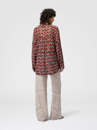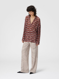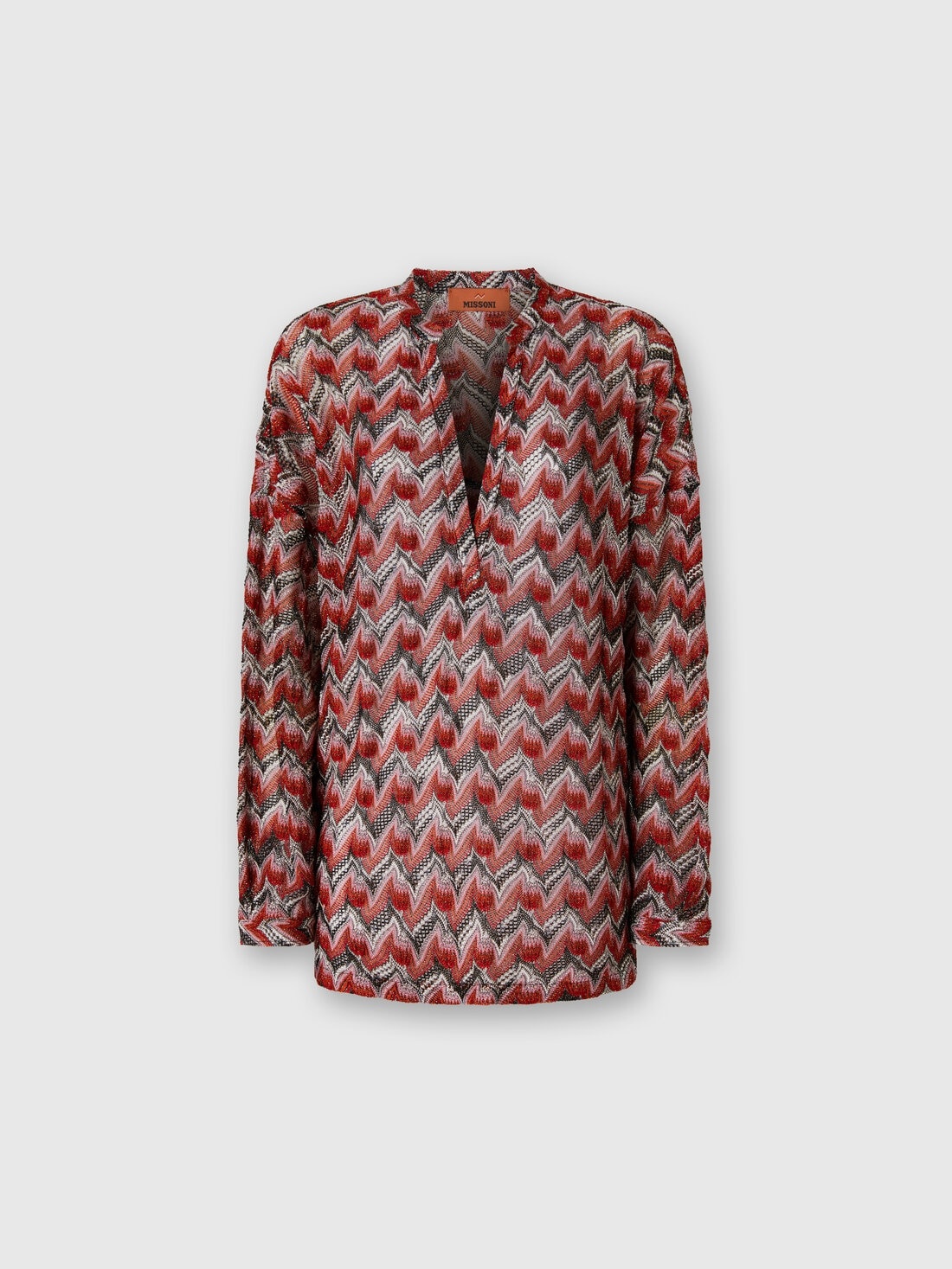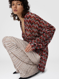 An oversized blouse with mandarin collar and feminine V-neck, featuring raschel lace that evokes the iconic Missoni zigzag. Made from viscose and lame blend, the piece combines elegance and brightness, creating a sophisticated and high-impact look. MORE DETAILS - Oversized blouse with mandarin collar - V-neck - Raschel knit - Embroidered lace - Viscose blend with lame threads Composition: EXTERNAL:89%Rayon, 11%Metal Fiber Care instructions: Dry cleaning in tetrachloroethene - mild process ; Wash max 30°C - Very mild process ; Steam iron only ; Do not tumble dry ; Dry flat ; Do not iron ; Do not bleach Made in: Italy Product ID DS25WJ0OBR012PS4175