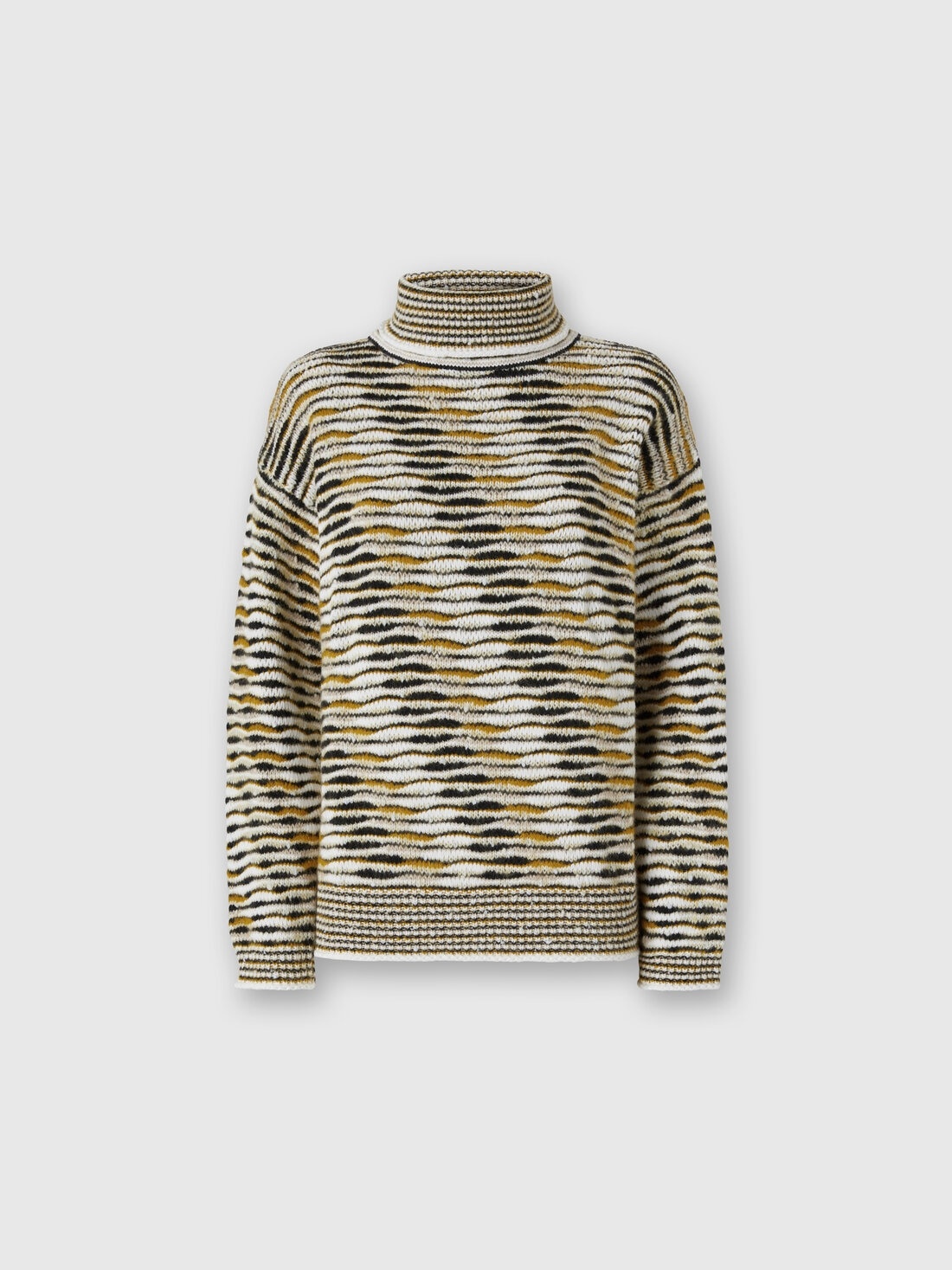 This oversized women’s turtleneck sweater by Missoni, made of cotton blend, stands out for its refined slubbed workmanship—a technique that fully expresses the brand’s mastery in yarn crafting. The wide silhouette and relaxed design provide exceptional comfort, while the soft texture and special workmanship give the piece a distinctive character, perfect for a contemporary look that blends elegance and modernity. MORE DETAILS - Turtleneck sweater - Boxy fit - Flame knit - Cotton blend Composition: EXTERNAL:42%Cotton, 34%Polyamide, 8%Polyester, 7%Mohair goat, 5%Alpaca Fibra, 3%Wool, 1%Elastane Care instructions: Ironing maximum temperature 110°C - without steam ; Hand wash ; Dry cleaning in tetrachloroethene ; Wash inside out ; COOL HAND WASH ; Do not tumble dry ; Dry flat ; Iron with a cloth between ; Do not bleach Made in: Italy Product ID DS25WN01BK01BTSM9SU