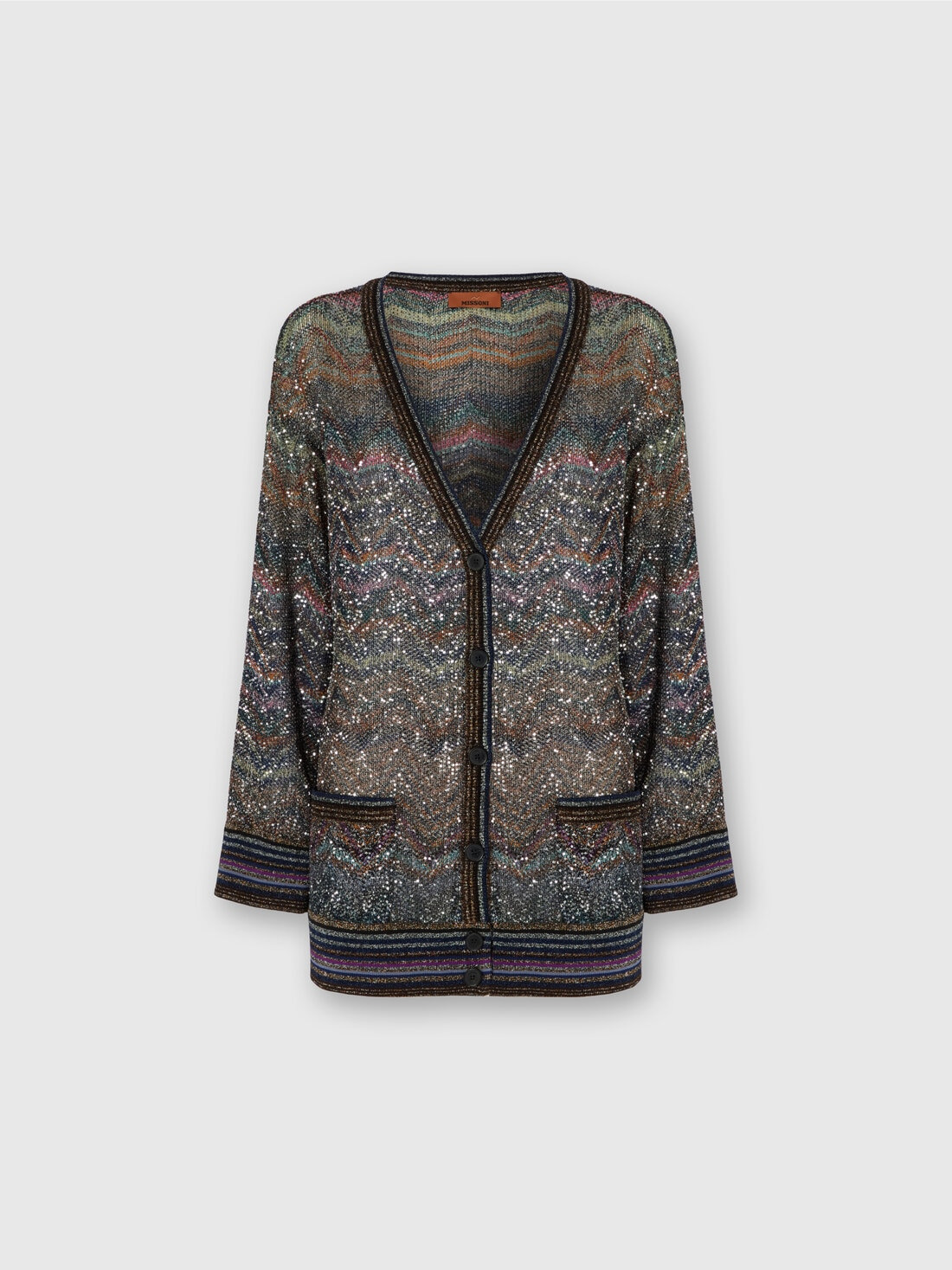 An expression of Missoni’s craftsmanship and distinctive expertise, this oversized women’s cardigan with V-neck, buttons, and pockets is made on a Caperdoni loom with the iconic zigzag motif. Embellished with sequins and lame threads, it combines relaxed volumes and luminous details in a design that celebrates tradition with a contemporary vision. MORE DETAILS - Oversized V-neck cardigan with buttons and pockets - Caperdoni loom knit - Zigzag pattern - Viscose blend with lame threads Composition: EXTERNAL:47%Rayon, 26%Polyamide, 21%Polyester, 6%Metal Fiber Care instructions: Hand wash ; Dry cleaning in tetrachloroethene - mild process ; Steam iron only ; Dry flat ; Do not tumble dry ; Do not iron ; Do not bleach Made in: Italy Product ID DS25WM0TBC005GS91P6