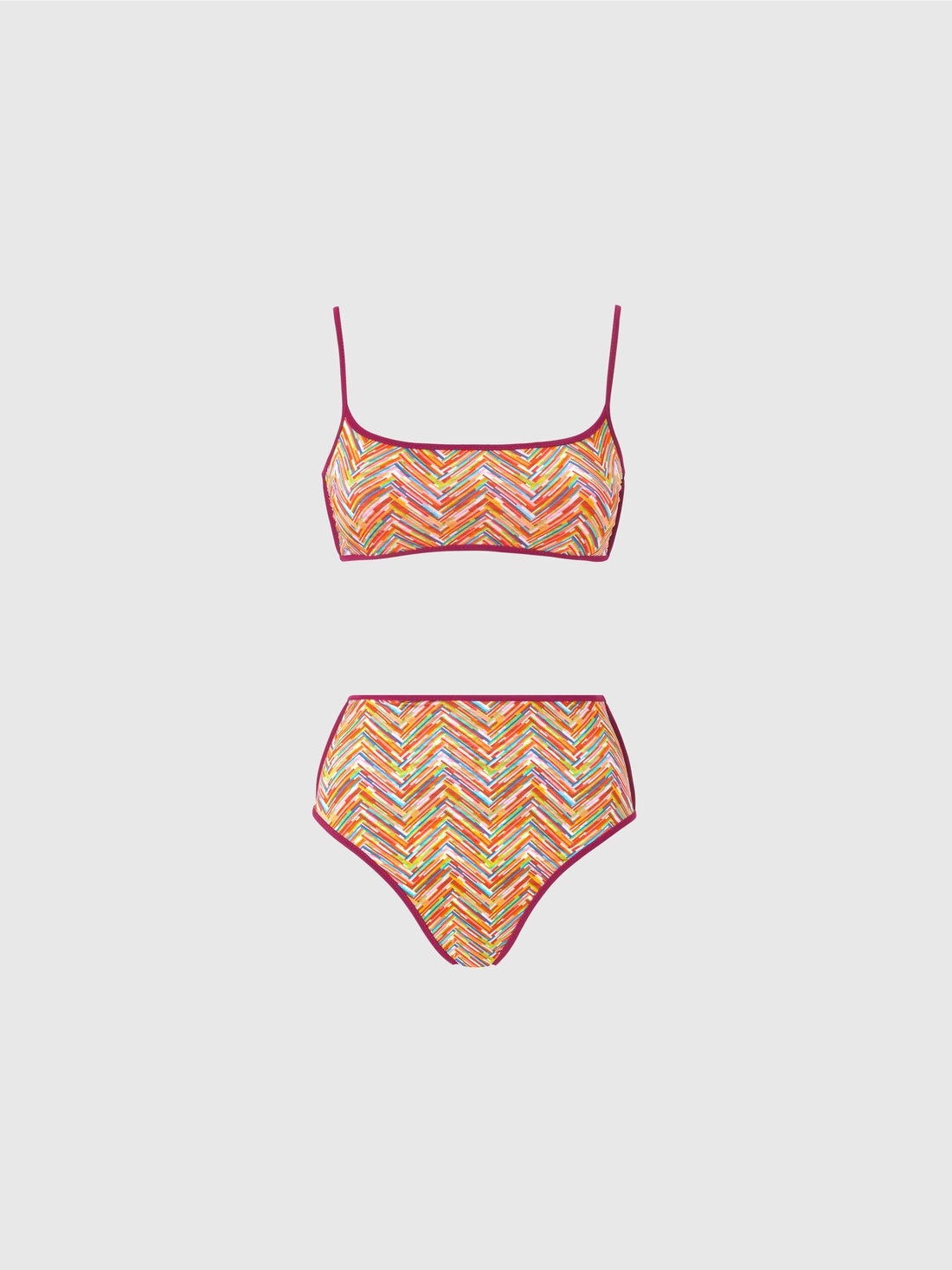 Bikini with iconic zigzag pattern. The reversible design makes it easy to change the look, while the high-waisted top and briefs provide a comfortable and versatile fit, enhancing the silhouette with a touch of retro elegance. MORE DETAILS - Reversible bikini - Zigzag pattern - High-waisted briefs Composition: EXTERNAL:86%Polyester, 14%Elastane; LINING : 80%Polyamide, 20%Elastane Care instructions: Hand wash ; Do not tumble dry ; Do not dry clean ; Do not iron ; Do not bleach Made in: Italy Product ID MS25SP03BJ00LHSM9MZ