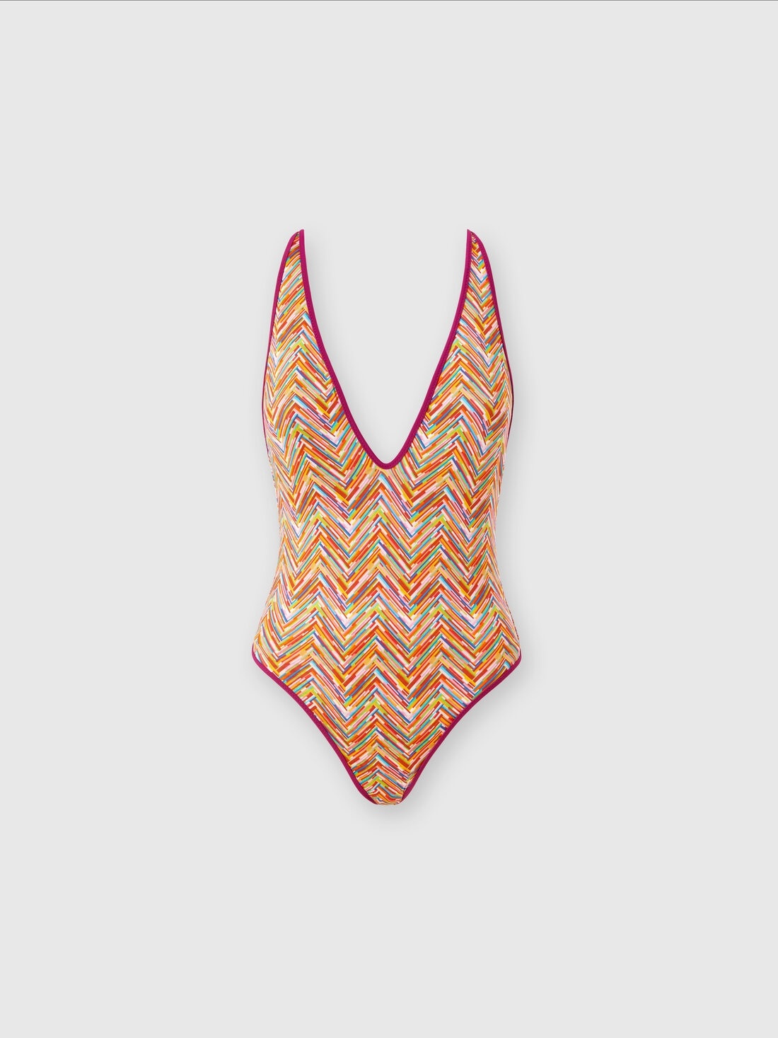 A one-piece swimsuit with clean lines and a V-neck, characterized by its reversible functionality. Two distinct designs come together in a single garment, with a graphic print that gives dynamism and versatility, allowing you to change your look in an instant without sacrificing style. MORE DETAILS - Swimsuit model with print - Reversible - V-neck Composition: EXTERNAL:86%Polyester, 14%Elastane; LINING : 80%Polyamide, 20%Elastane Care instructions: Hand wash ; Do not tumble dry ; Do not dry clean ; Do not iron ; Do not bleach Made in: Italy Product ID MC22SP03BJ00LHSM9MZ