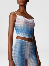 A feminine and versatile top with a design inspired by scarves, made from degrade lace in viscose and lame. The bateau neckline, tie straps, and back lace closure create a perfect balance between sensuality and sophistication. MORE DETAILS - Women's top - Scarf-cut design - Degrade lace workmanship - Tie closure at the back Composition: EXTERNAL:93%Rayon, 7%Metal Fiber Care instructions: Ironing maximum temperature 110°C - without steam ; Dry cleaning in tetrachloroethene ; Do not tumble dry ; Do not wash ; Do not bleach Made in: Italy Product ID MC25SK05BR0131S72L3
