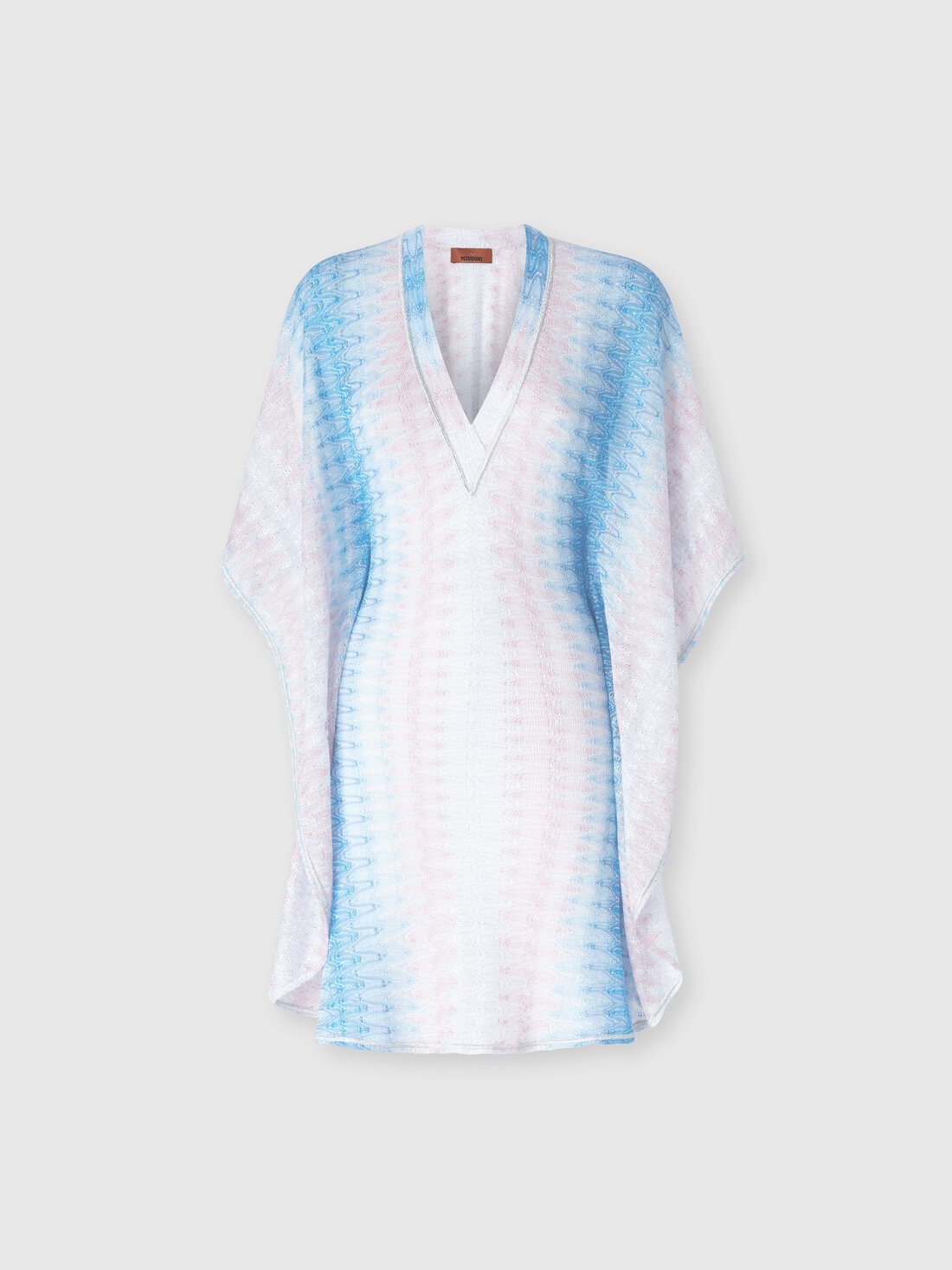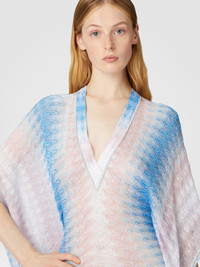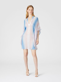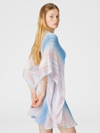A short caftan with sophisticated appeal, featuring a V-neckline and a slightly balloon-shaped silhouette. The degrade lacework, enriched with viscose and lame, adds a touch of lightness and femininity, perfect for relaxing summer moments. MORE DETAILS - Women's short cover-up - Caftan design - Degrade lace workmanship - Viscose and lame fabric - V-neck Composition: EXTERNAL:93%Rayon, 7%Metal Fiber Care instructions: Ironing maximum temperature 110°C - without steam ; Dry cleaning in tetrachloroethene ; Do not tumble dry ; Do not wash ; Do not bleach Made in: Italy Product ID MC25SQ08BR0131S72L3