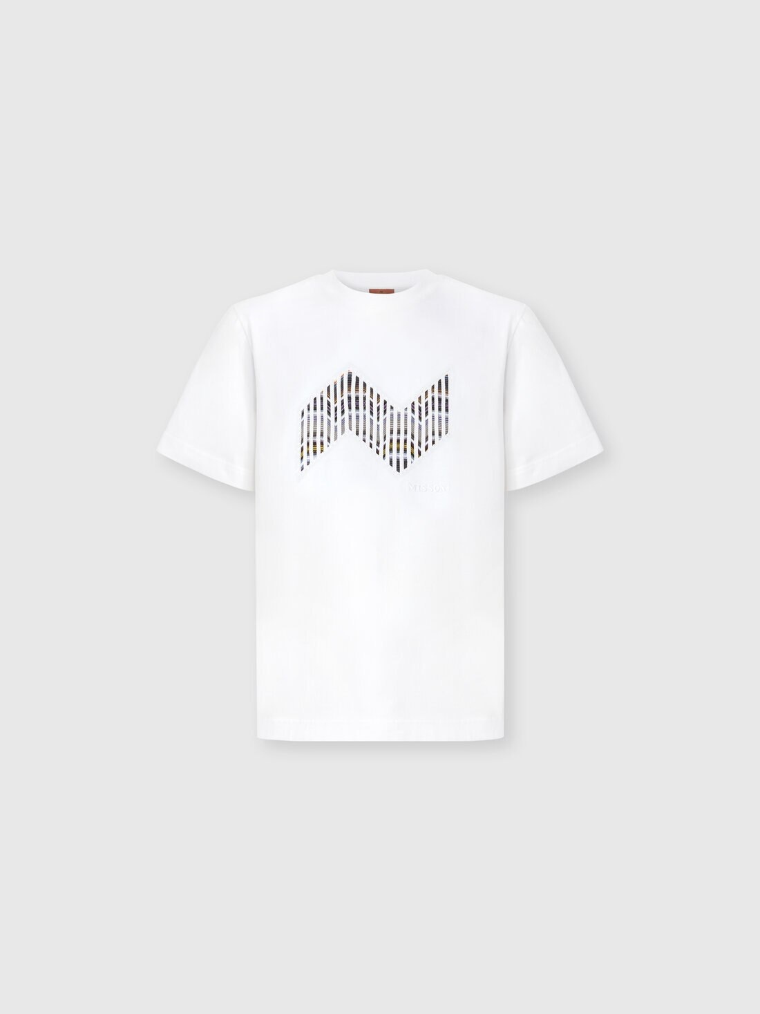 Clean lines and bold graphics define this men’s short-sleeve T-shirt in cotton jersey, offered in a regular fit. The raschel insert highlights an elegant geometric zigzag, reinterpreting one of Missoni’s most iconic patterns with a textural edge. The tone-on-tone embroidered logo adds a subtle yet distinctive touch, signing the garment with elegance. MORE DETAILS - T-shirt short sleeve - Regular fit - 100% cotton - Cotton jersey - Geometric zigzag raschel insert - Logo embroidery Composition: EXTERNAL:100%Cotton; TRIMMING:100%Cotton Care instructions: Wash max 30°C - Mild process ; Ironing maximum temperature 110°C - without steam ; Do not tumble dry ; Do not dry clean ; Do not bleach Made in: Tunisia Product ID US25WL07BJ00OYS01I6