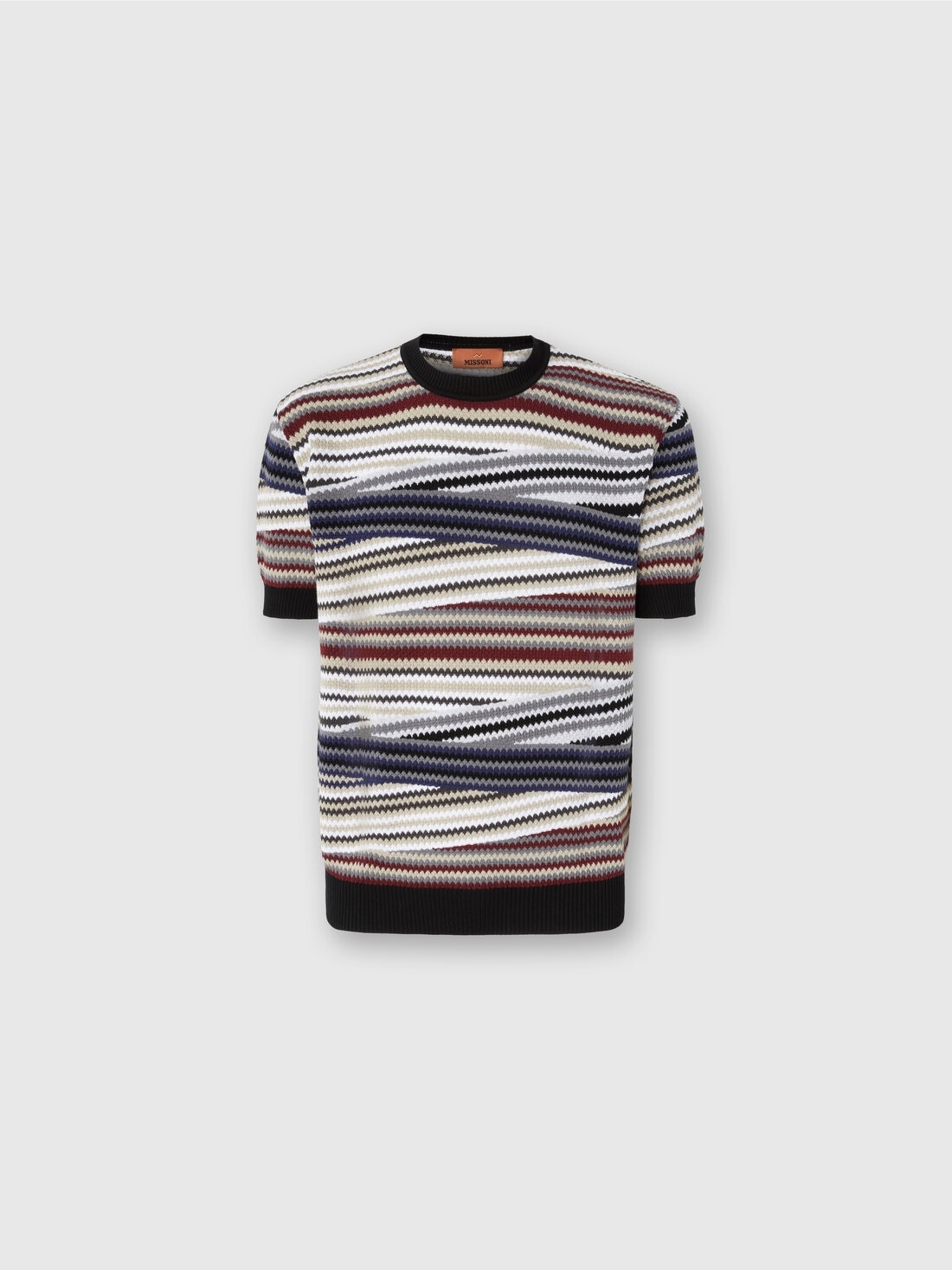 Fresh and contemporary, this men’s short-sleeve T-shirt in 100% cotton reinterprets the classic Missoni motif with a striped micro zigzag full of graphic and sophisticated appeal. The contrasting trim adds a dynamic touch, enhancing the design with subtle originality. MORE DETAILS - T-shirt short sleeve - Micro striped zigzag pattern - 100% cotton - Contrast trims Composition: EXTERNAL:100%Cotton Care instructions: Hand wash ; Ironing maximum temperature 110°C - without steam ; Dry cleaning in tetrachloroethene ; Do not tumble dry ; Dry flat ; Do not bleach Made in: Italy Product ID US25WL05BK01CTSM9RX
