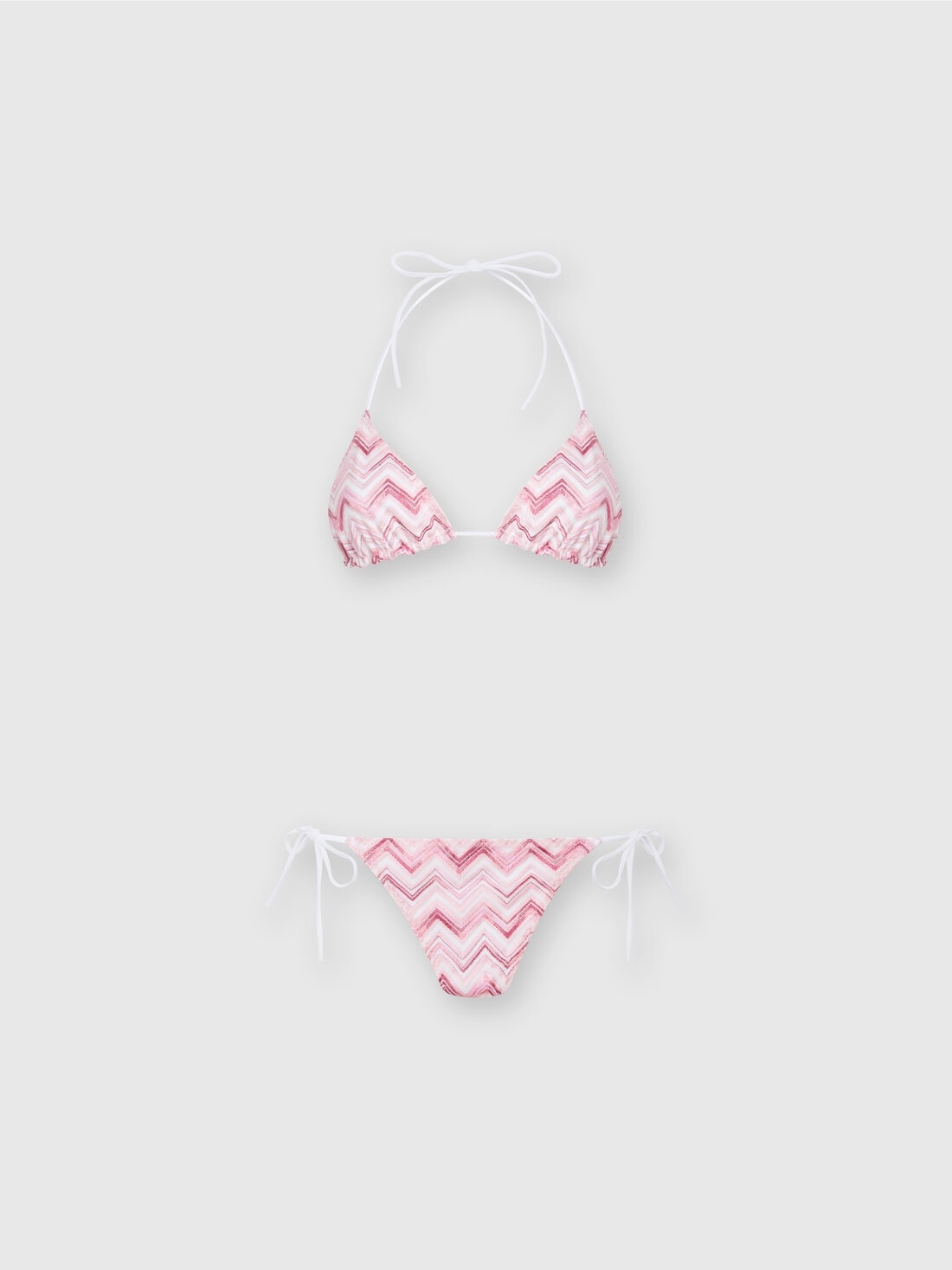 Refined and refined, the viscose-blend bikini with a slub zigzag pattern captures the essence of luxury beachwear by Missoni. Composed of a triangle top and a slip with laces, the model stands out for its play of colors and rich texture, which enhances the silhouette with natural elegance. MORE DETAILS - Viscose bikini - Flaming zigzag pattern - Triangle top - Briefs with laces Composition: EXTERNAL:65%Rayon, 29%Polyamide, 6%Elastane; LINING : 80%Polyamide, 20%Elastane Care instructions: Hand wash ; Do not tumble dry ; Do not dry clean ; Do not iron ; Do not bleach Made in: Italy Product ID MC22SP00BJ00NBS30EV