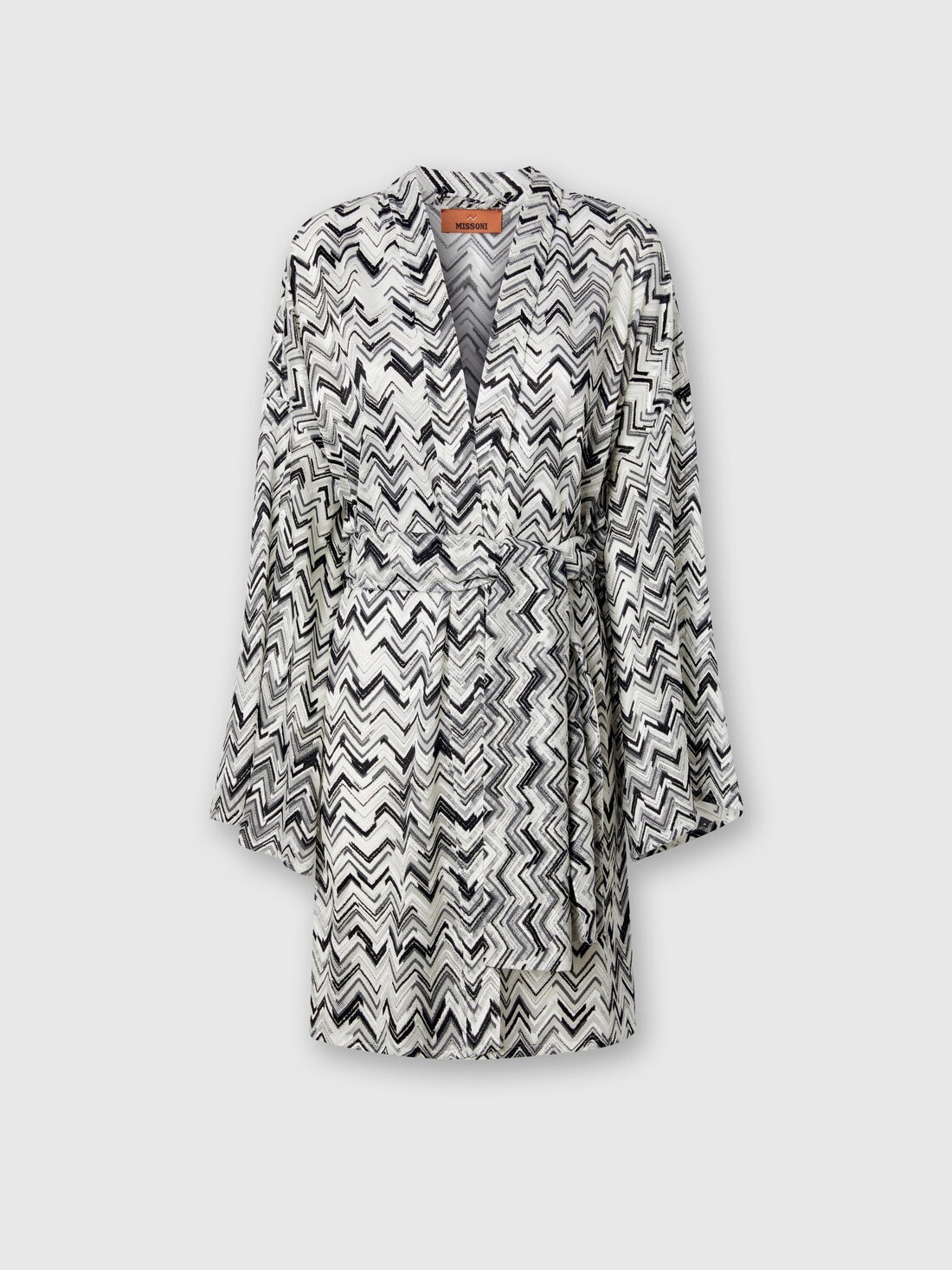 A refined interweaving of precious yarns gives life to this viscose-blend cover-up kimono, where the flamed zigzag motif takes shape in a play of light and color. The softness of the fabric meets the lightness, while the waist belt defines a natural silhouette. MORE DETAILS - Kimono Cover-Up with Belt - Viscose Blend - Zigzag pattern Composition: EXTERNAL:65%Rayon, 29%Polyamide, 6%Elastane Care instructions: Ironing maximum temperature 110°C - without steam ; Dry cleaning in tetrachloroethene ; Do not tumble dry ; Do not wash ; Do not bleach Made in: Italy Product ID MS25SQ15BJ00NBS91NP