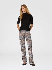 A long, straight-leg women’s trouser that stands out for its refined wave motif, interpreted in a graphic and contemporary key. Made from a fine viscose and wool blend, it combines texture and movement in a piece with a bold, sophisticated character. MORE DETAILS - Straight-leg long pants - Wave pattern - Viscose and wool blend Composition: EXTERNAL:52%Rayon, 44%Wool, 3%Polyamide, 1%Elastane Care instructions: Ironing maximum temperature 110°C - without steam ; Dry cleaning in tetrachloroethene ; Iron inside out ; Steam iron only ; Do not tumble dry ; Dry flat ; Do not wash ; Do not bleach Made in: Romania Product ID DS25WI0MBK01C0SM9SR