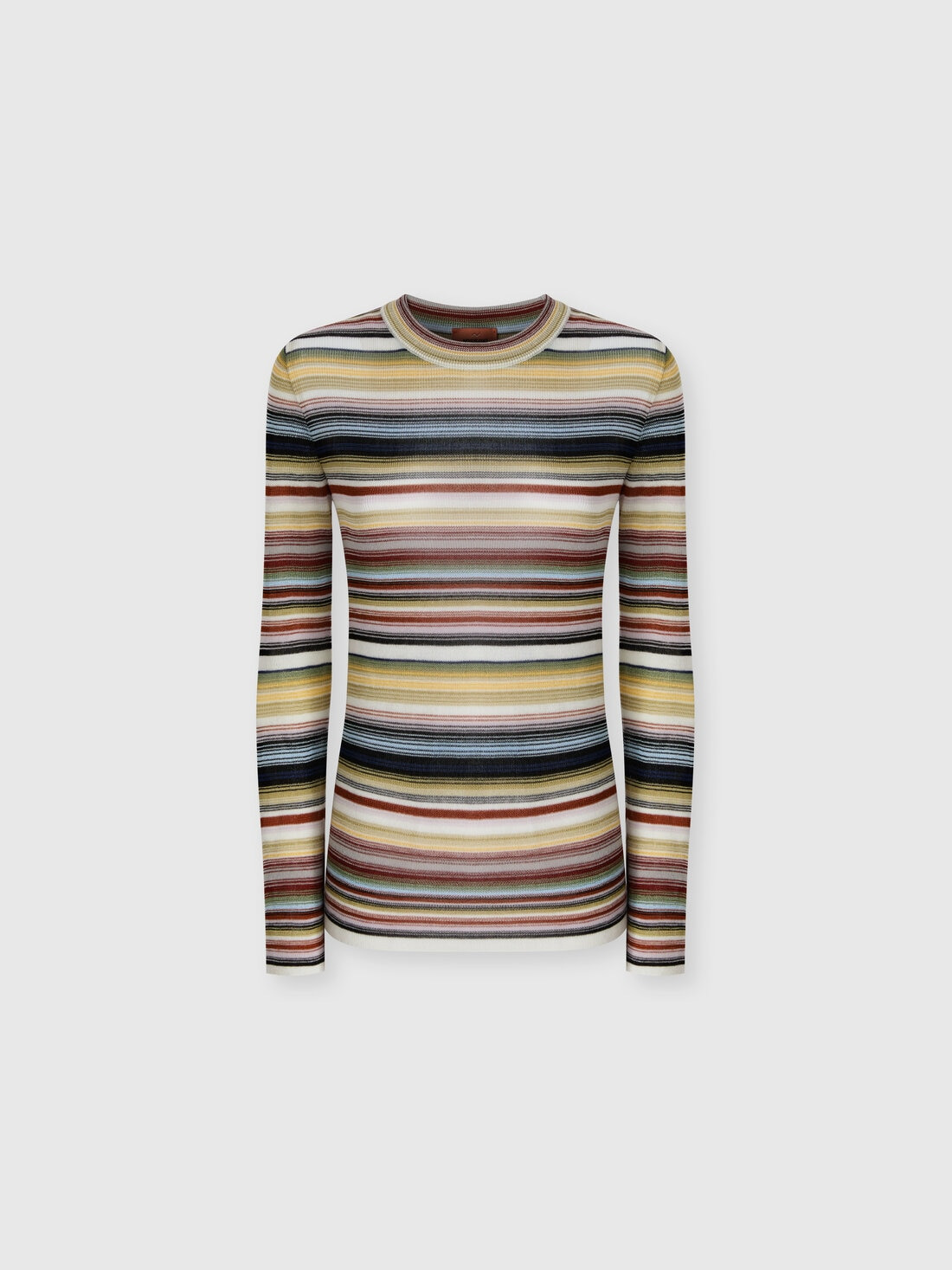 A contemporary reinterpretation of knitwear, designed for those who value both simplicity and personality. This women’s crewneck sweater is crafted in a wool-viscose blend. Its fluid construction reflects Missoni’s craftsmanship, resulting in a piece that fuses comfort, style, and identity into a clean, graphic statement. MORE DETAILS - Women's long sleeve crewneck sweater - Striped pattern - Wool and viscose blend Composition: EXTERNAL:80%Rayon, 20%Wool Care instructions: Hand wash ; Ironing maximum temperature 110°C - without steam ; Wash in net bag ; Dry cleaning in tetrachloroethene ; Dry flat ; Do not tumble dry ; Reshape when damp ; Wash separately ; Do not bleach Made in: Romania Product ID DS25WN2SBK01G0SM9WI
