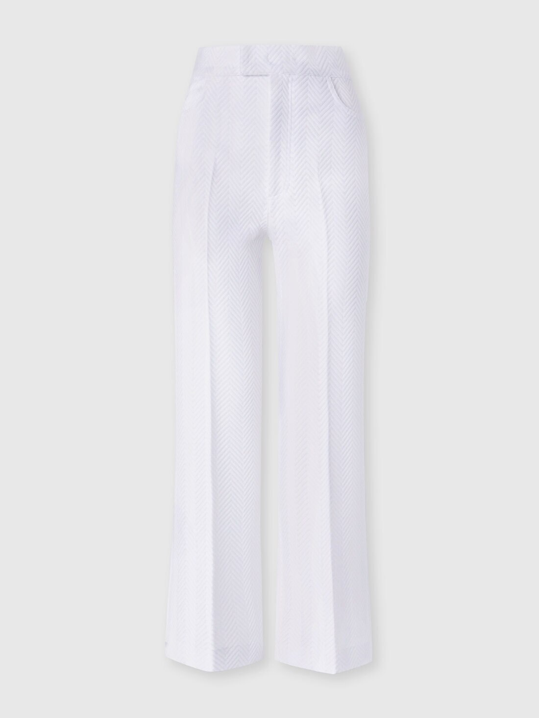 A tailored women’s trouser that reinterprets the iconic Missoni zigzag pattern with elegance, presented in a tone-on-tone version through refined raschel workmanship. Made from a cotton blend, it combines structure and graphic identity in a distinctive piece with a contemporary taste. MORE DETAILS - Tailored pants - Raschel zig zag knit - Cotton blend Composition: EXTERNAL:74%Cotton, 26%Rayon Care instructions: Wash max 30°C ; Dry cleaning in tetrachloroethene - mild process ; Steam iron only ; Do not tumble dry ; Dry flat ; Do not iron ; Do not bleach Made in: Italy Product ID DS25WI01BR00JC10601