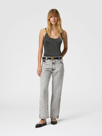An essential yet refined women’s tank top, made from viscose and lame blend with fine vanise workmanship. The round neckline enhances the clean lines of the garment, while the metallic reflections elevate its texture with subtle elegance. MORE DETAILS - Tank top with round neckline - Vanise knit - Viscose and lame blend Composition: EXTERNAL:88%Rayon, 12%Metal Fiber Care instructions: Ironing maximum temperature 110°C - without steam ; Dry cleaning in tetrachloroethene - mild process ; Do not tumble dry ; Dry flat ; Iron inside out ; Dry inside out ; Iron with a cloth between ; Do not wash ; Do not bleach Made in: Romania Product ID DS25WK0MBK01BYL905D