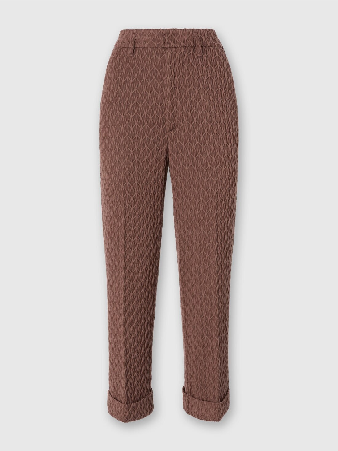 A tapered women’s trouser with cuff that blends elegance and structure, made from ribbed raschel lace. The wool and viscose blend gives the piece a rich and refined texture, for a sophisticated look with a hint of originality. MORE DETAILS - Tapered fit pants with cuff - Raschel ribbed lace-effect knit - Wool and viscose blend Composition: EXTERNAL:54%Wool, 46%Rayon; INTERNAL REINFORCEMENT:100%Polyester Care instructions: Hand wash ; Dry cleaning in tetrachloroethene - mild process ; Do not tumble dry ; Dry flat ; Steam iron only ; Do not iron ; Do not bleach Made in: Italy Product ID DS25WI0UBR012J81314
